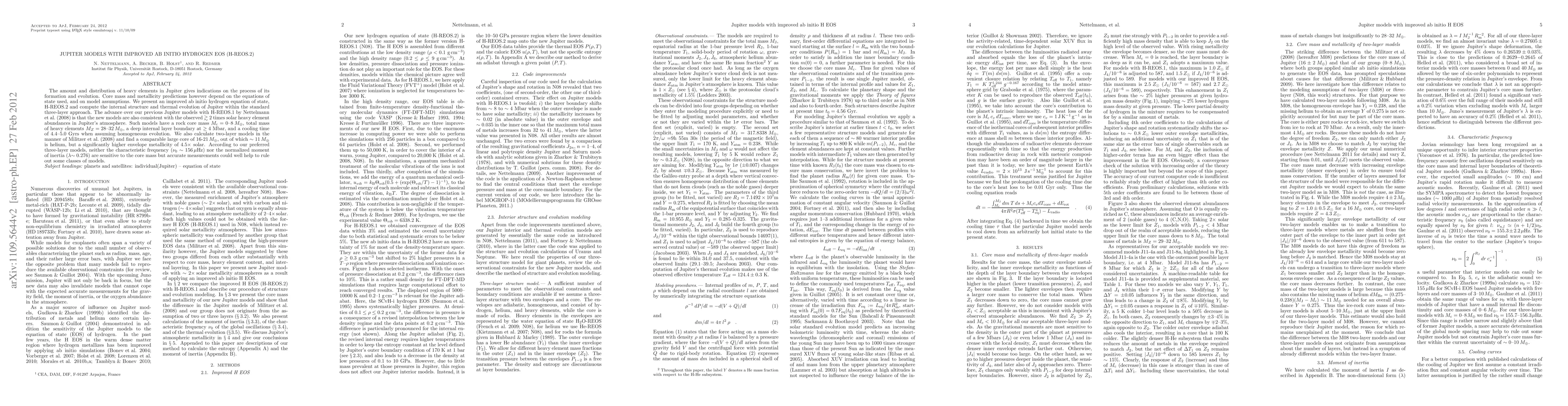 This paper presents an improved ab initio hydrogen equation of state (H-REOS.2) to model Jupiter's internal structure and thermal evolution, showing consistency with observed heavy element abundances. The preferred three-layer models suggest a core mass of 0-8 ME and a total heavy element mass of 28-32 ME, with a cooling time of 4.4-5.0 Gyrs.