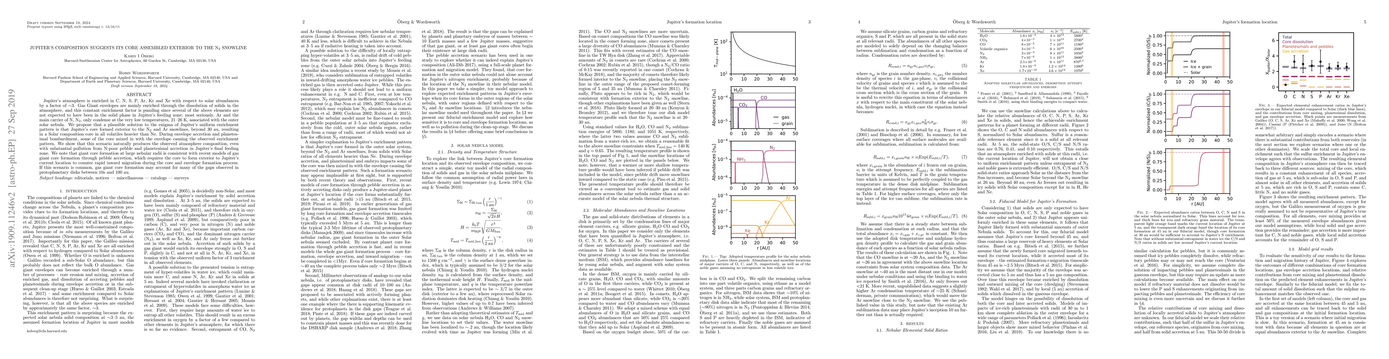 This paper proposes that Jupiter's core formed beyond the N2 and Ar snowlines, leading to a core with solar composition in heavier volatiles. The observed atmospheric enrichment is attributed to mixing of this core with the envelope during accretion, explaining the uniform enrichment pattern despite elements condensing at low temperatures.