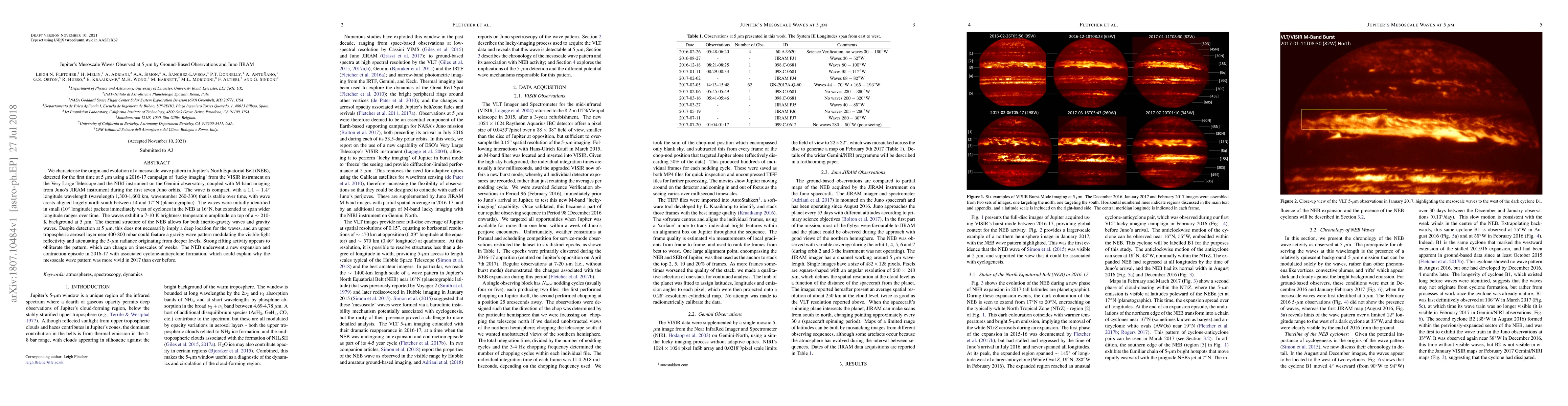 We characterise the origin and evolution of a mesoscale wave pattern in Jupiter's North Equatorial Belt (NEB), detected for the first time at 5 $\mu$m using a 2016-17 campaign of `lucky imaging' from the VISIR instrument on the Very Large Telescope and the NIRI instrument on the Gemini observatory, coupled with M-band imaging from Juno's JIRAM instrument during the first seven Juno orbits. The wave is compact, with a $1.1-1.4^\circ$ longitude wavelength (wavelength 1,300-1,600 km, wavenumber 260-330) that is stable over time, with wave crests aligned largely north-south between $14$ and $17^\circ$N (planetographic). The waves were initially identified in small ($10^\circ$ longitude) packets immediately west of cyclones in the NEB at $16^\circ$N, but extended to span wider longitude ranges over time. The waves exhibit a 7-10 K brightness temperature amplitude on top of a $\sim210$-K background at 5 $\mu$m. The thermal structure of the NEB allows for both inertio-gravity waves and gravity waves. Despite detection at 5 $\mu$m, this does not necessarily imply a deep location for the waves, and an upper tropospheric aerosol layer near 400-800 mbar could feature a gravity wave pattern modulating the visible-light reflectivity and attenuating the 5-$\mu$m radiance originating from deeper levels. Strong rifting activity appears to obliterate the pattern, which can change on timescales of weeks. The NEB underwent a new expansion and contraction episode in 2016-17 with associated cyclone-anticyclone formation, which could explain why the mesoscale wave pattern was more vivid in 2017 than ever before.