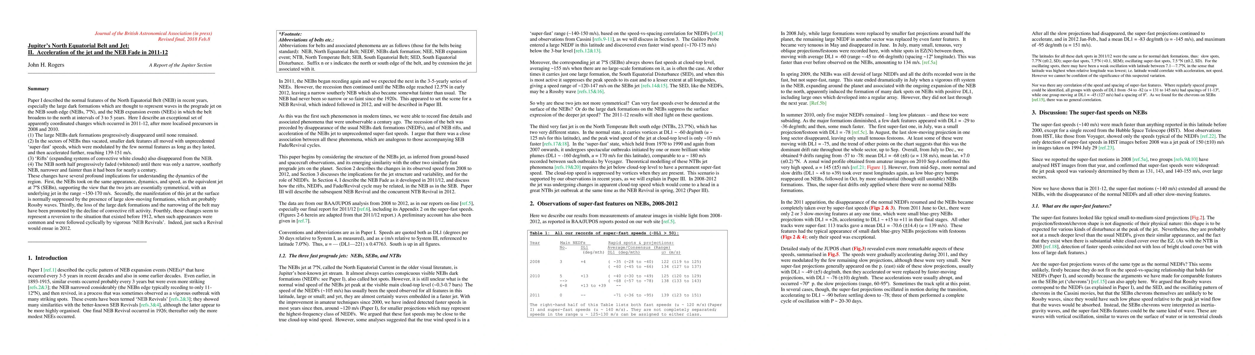 Paper I described the normal features of the North Equatorial Belt (NEB) in recent years, especially the large dark formations which are thought to represent waves in the prograde jet on the NEB south edge (NEBs, 7N), and the NEB expansion events (NEEs) in which the belt broadens to the north at intervals of 3 to 5 years. Here I describe an exceptional set of apparently coordinated changes which occurred in 2011-12, after more localised precursors in 2008 and 2010. (1) The large NEBs dark formations progressively disappeared until none remained. (2) In the sectors of NEBs thus vacated, smaller dark features all moved with unprecedented super-fast speeds, which were modulated by the few normal features as long as they lasted, and then accelerated further, reaching 139-151 m/s. (3) Rifts (expanding systems of convective white clouds) also disappeared from the NEB. (4) The NEB north half progressively faded (whitened) until there was only a narrow, southerly NEB, narrower and fainter than it had been for nearly a century. These changes have several profound implications for understanding the dynamics of the region. First, the NEBs took on the same appearance, dynamics, and speed, as the equivalent jet at 7S (SEBn), supporting the view that the two jets are essentially symmetrical, with an underlying jet in the range 150-170 m/s. Secondly, the manifestation of this jet at the surface is normally suppressed by the presence of large slow-moving formations, which are probably Rossby waves. Thirdly, the loss of the large dark formations and the narrowing of the belt may have been promoted by the decline of convective rift activity. Fourthly, these changes seem to represent a reversion to the situation that existed before 1912, when such appearances were common and were followed cyclically by vigorous NEB Revivals. Indeed, just such a Revival would ensue in 2012.