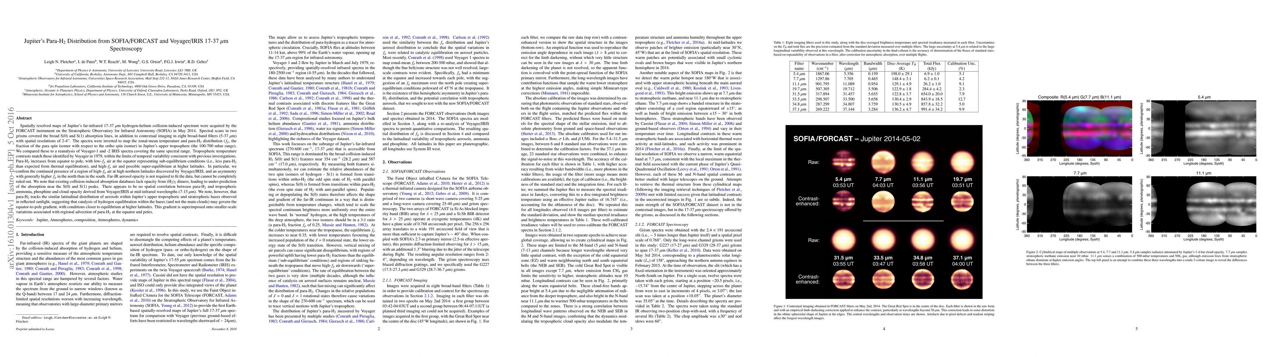 Spatially resolved maps of Jupiter's far-infrared 17-37 $\mu$m hydrogen-helium collision-induced spectrum were acquired by the FORCAST instrument on the Stratospheric Observatory for Infrared Astronomy (SOFIA) in May 2014. Spectral scans in two grisms covered the broad S(0) and S(1) absorption lines, in addition to contextual imaging in eight broad-band filters (5-37 $\mu$m) with spatial resolutions of 2-4". The spectra were inverted to map the zonal-mean temperature and para-H$_2$ distribution ($f_p$, the fraction of the para spin isomer with respect to the ortho spin isomer) in Jupiter's upper troposphere (the 100-700 mbar range). We compared these to a reanalysis of Voyager-1 and -2 IRIS spectra covering the same spectral range. Para-H$_2$ increases from equator to pole, with low-$f_p$ air at the equator representing sub-equilibrium conditions (i.e., less para-H$_2$ than expected from thermal equilibration), and high-$f_p$ air and possible super-equilibrium at higher latitudes. In particular, we confirm the continued presence of a region of high-$f_p$ air at high northern latitudes discovered by Voyager/IRIS, and an asymmetry with generally higher $f_p$ in the north than in the south. We note that existing collision-induced absorption databases lack opacity from (H$_2$)$_2$ dimers, leading to under-prediction of the absorption near the S(0) and S(1) peaks. There appears to be no spatial correlation between para-H$_2$ and tropospheric ammonia, phosphine and cloud opacity derived from Voyager/IRIS at mid-infrared wavelengths (7-15 $\mu$m). We note, however, that para-H$_2$ tracks the similar latitudinal distribution of aerosols within Jupiter's upper tropospheric and stratospheric hazes observed in reflected sunlight, suggesting that catalysis of hydrogen equilibration within the hazes (and not the main clouds) may govern the equator-to-pole gradient. [Abridged]