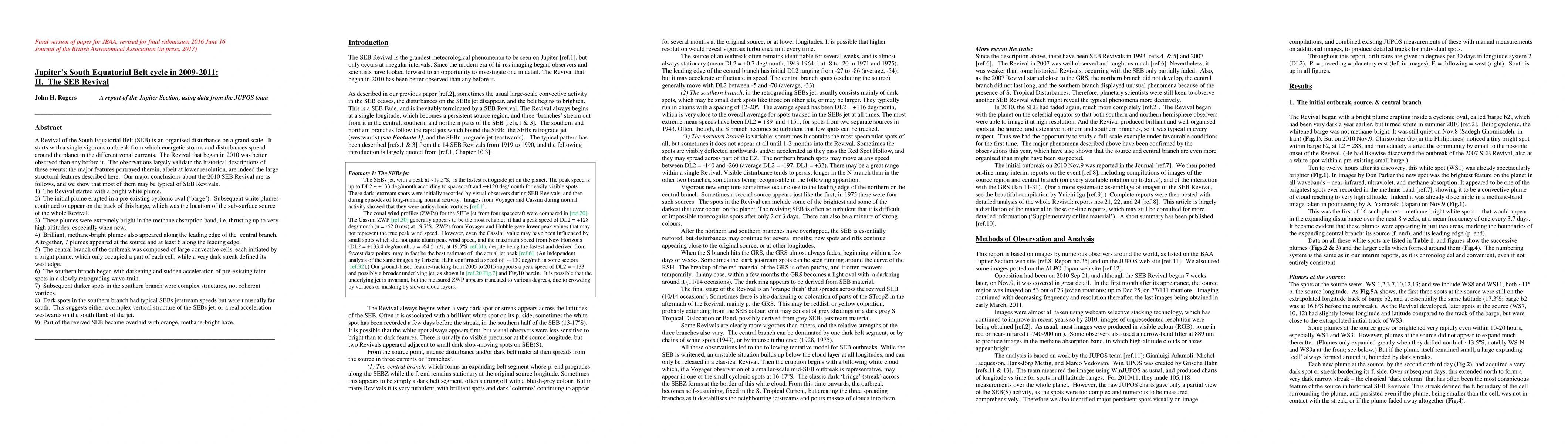 A Revival of the South Equatorial Belt (SEB) is an organised disturbance on a grand scale. It starts with a single vigorous outbreak from which energetic storms and disturbances spread around the planet in the different zonal currents. The Revival that began in 2010 was better observed than any before it. The observations largely validate the historical descriptions of these events: the major features portrayed therein, albeit at lower resolution, are indeed the large structural features described here. Our major conclusions about the 2010 SEB Revival are as follows, and we show that most of them may be typical of SEB Revivals. 1) The Revival started with a bright white plume. 2) The initial plume erupted in a pre-existing cyclonic oval ('barge'). Subsequent white plumes continued to appear on the track of this barge, which was the location of the sub-surface source of the whole Revival. 3) These plumes were extremely bright in the methane absorption band, i.e. thrusting up to very high altitudes, especially when new. 4) Brilliant, methane-bright plumes also appeared along the leading edge of the central branch. Altogether, 7 plumes appeared at the source and at least 6 along the leading edge. 5) The central branch of the outbreak was composed of large convective cells, each initiated by a bright plume, which only occupied a part of each cell, while a very dark streak defined its west edge. 6) The southern branch began with darkening and sudden acceleration of pre-existing faint spots in a slowly retrograding wave-train. 7) Subsequent darker spots in the southern branch were complex structures, not coherent vortices. 8) Dark spots in the southern branch had typical SEBs jetstream speeds but were unusually far south....