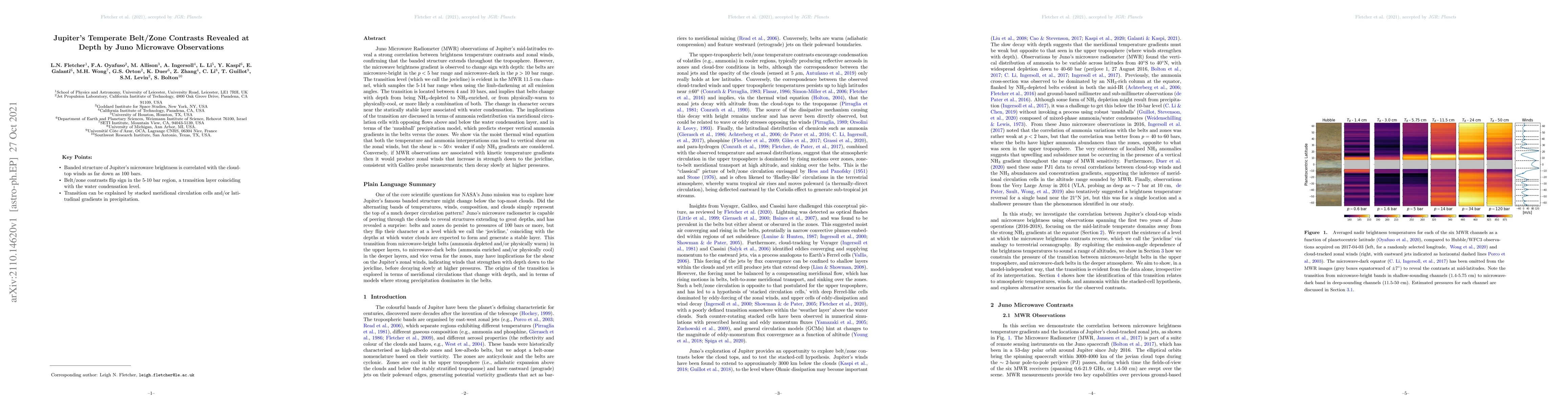 Juno's microwave observations reveal a strong correlation between Jupiter's zonal winds and brightness temperature contrasts in its mid-latitudes, with a notable change in character near the jovicline (4-10 bar range), suggesting ammonia redistribution via meridional circulation cells.