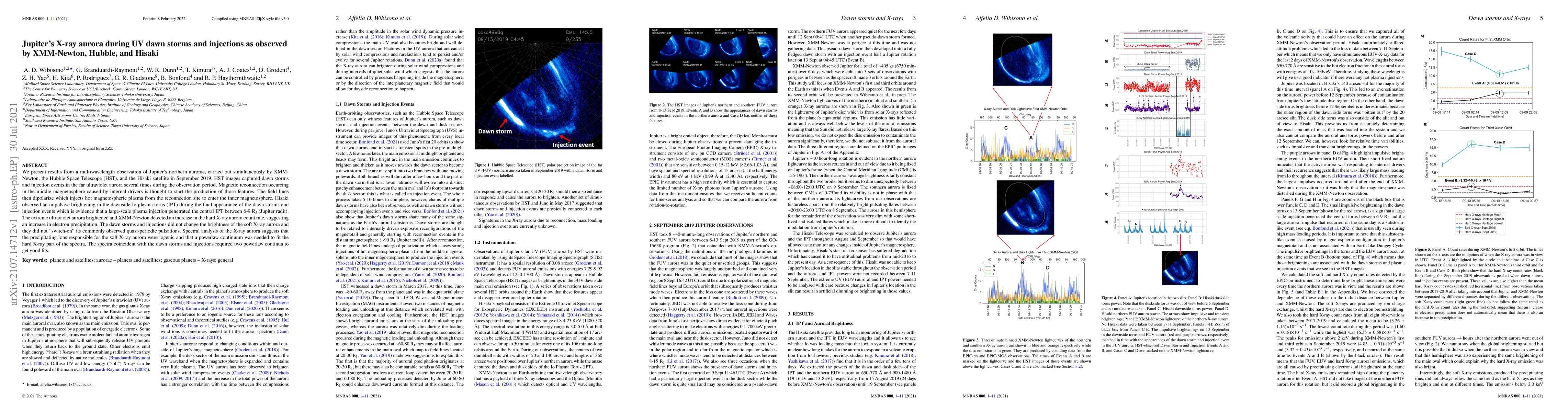 We present results from a multiwavelength observation of Jupiter's northern aurorae, carried out simultaneously by XMM-Newton, the Hubble Space Telescope (HST), and the Hisaki satellite in September 2019. HST images captured dawn storms and injection events in the far ultraviolet aurora several times during the observation period. Magnetic reconnection occurring in the middle magnetosphere caused by internal drivers is thought to start the production of those features. The field lines then dipolarize which injects hot magnetospheric plasma from the reconnection site to enter the inner magnetosphere. Hisaki observed an impulsive brightening in the dawnside Io plasma torus (IPT) during the final appearance of the dawn storms and injection events which is evidence that a large-scale plasma injection penetrated the central IPT between 6-9 RJ (Jupiter radii). The extreme ultraviolet aurora brightened and XMM-Newton detected an increase in the hard X-ray aurora count rate, suggesting an increase in electron precipitation. The dawn storms and injections did not change the brightness of the soft X-ray aurora and they did not "switch-on" its commonly observed quasi-periodic pulsations. Spectral analysis of the X-ray aurora suggests that the precipitating ions responsible for the soft X-ray aurora were iogenic and that a powerlaw continuum was needed to fit the hard X-ray part of the spectra. The spectra coincident with the dawn storms and injections required two powerlaw continua to get good fits.