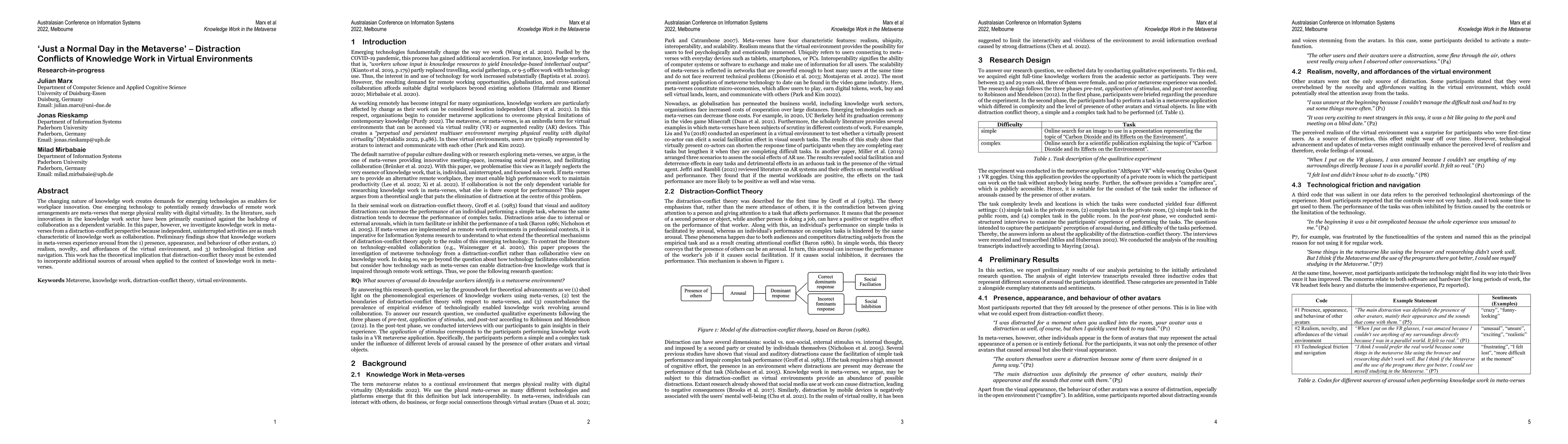This paper explores how knowledge work in metaverses is influenced by distraction conflicts, identifying three main sources of arousal: interactions with other avatars, the realism and novelty of the virtual environment, and technological friction. It suggests that distraction-conflict theory needs to be expanded to better understand these dynamics in virtual work settings.