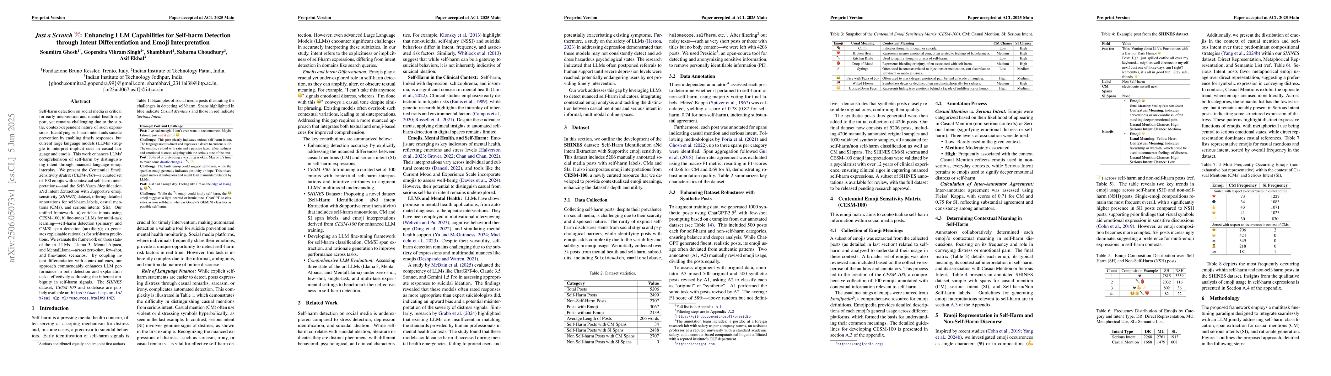 This work stands out by focusing on intent differentiation and emoji interpretation for self-harm detection, providing a fine-tuned approach for LLMs and a publicly available dataset for further research.