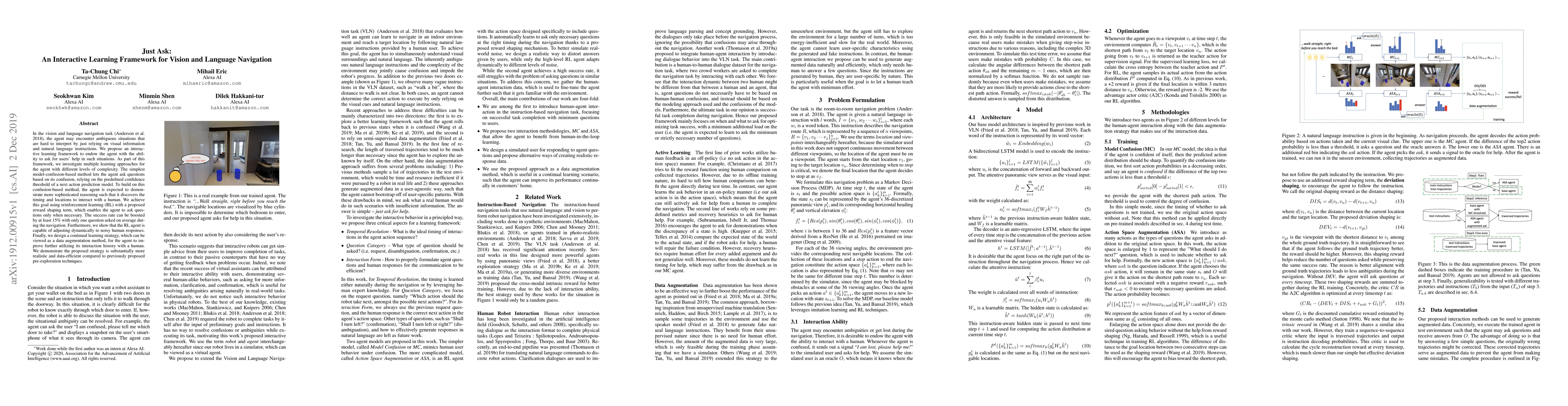 This paper proposes an interactive learning framework for vision and language navigation, enabling an agent to ask for user assistance in ambiguous situations. The framework employs reinforcement learning to optimize when and how to interact with humans, achieving a 15% boost in success rate with minimal questions.