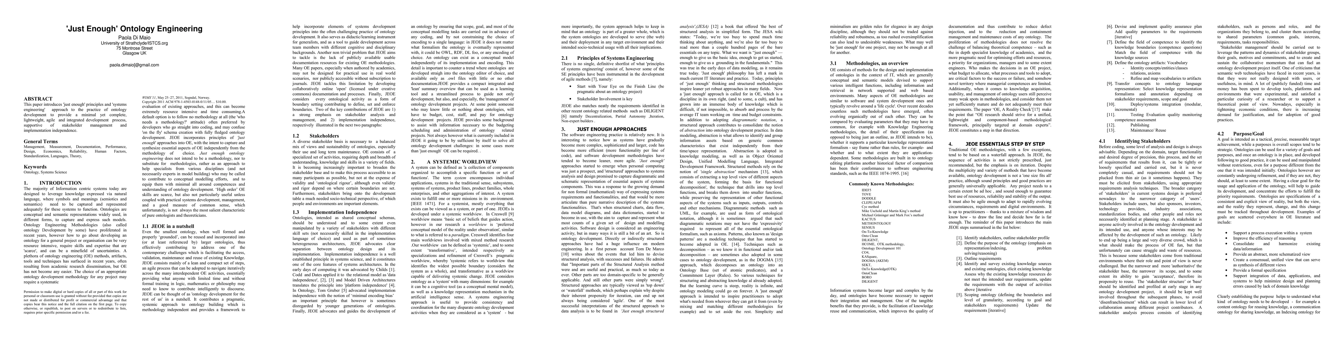 This paper proposes 'just enough' principles and a systems engineering approach to ontology development, aiming for a minimal yet comprehensive, lightweight, agile, and integrated process that supports stakeholder management and implementation independence.