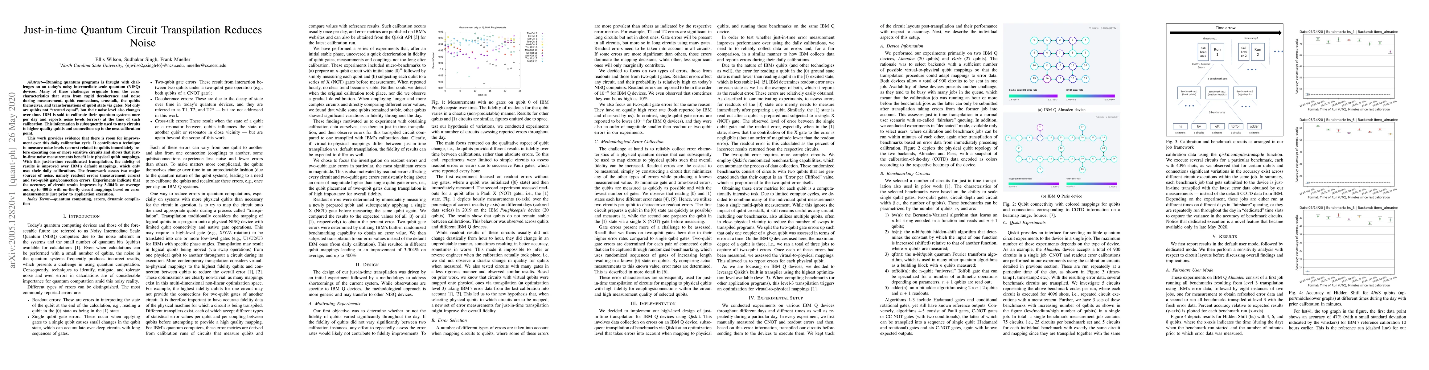 Running quantum programs is fraught with challenges on on today's noisy intermediate scale quantum (NISQ) devices. Many of these challenges originate from the error characteristics that stem from rapid decoherence and noise during measurement, qubit connections, crosstalk, the qubits themselves, and transformations of qubit state via gates. Not only are qubits not "created equal", but their noise level also changes over time. IBM is said to calibrate their quantum systems once per day and reports noise levels (errors) at the time of such calibration. This information is subsequently used to map circuits to higher quality qubits and connections up to the next calibration point. This work provides evidence that there is room for improvement over this daily calibration cycle. It contributes a technique to measure noise levels (errors) related to qubits immediately before executing one or more sensitive circuits and shows that just-in-time noise measurements benefit late physical qubit mappings. With this just-in-time recalibrated transpilation, the fidelity of results is improved over IBM's default mappings, which only uses their daily calibrations. The framework assess two major sources of noise, namely readout errors (measurement errors) and two-qubit gate/connection errors. Experiments indicate that the accuracy of circuit results improves by 3-304% on average and up to 400% with on-the-fly circuit mappings based on error measurements just prior to application execution.