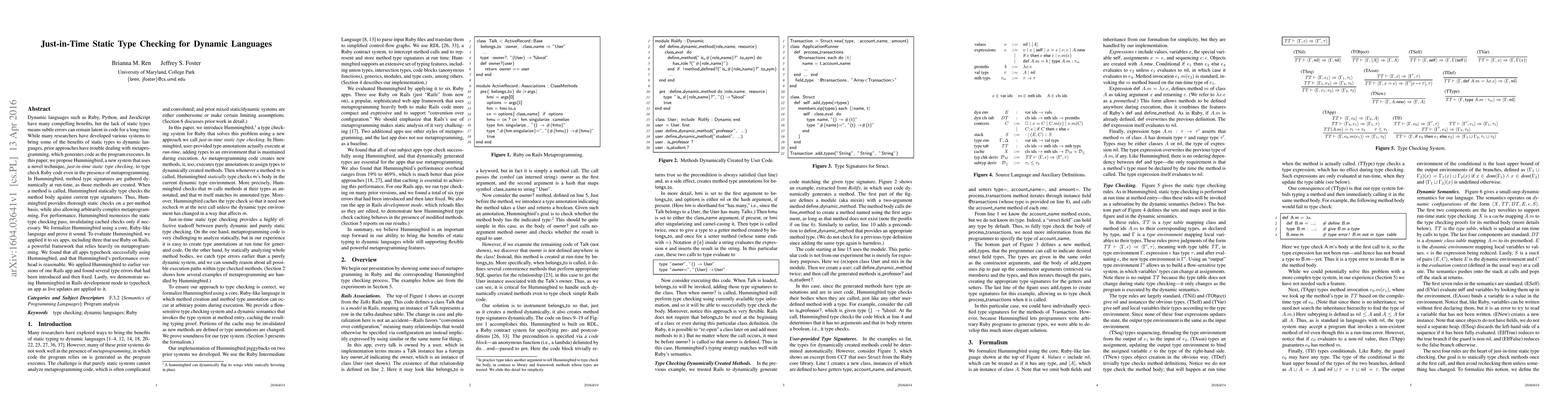 This paper introduces Hummingbird, a system for just-in-time static type checking in Ruby that dynamically gathers method type signatures during runtime, enabling thorough static checks even in the presence of metaprogramming. The system memoizes type checks for performance and was successfully applied to several Ruby applications, uncovering latent type errors.
