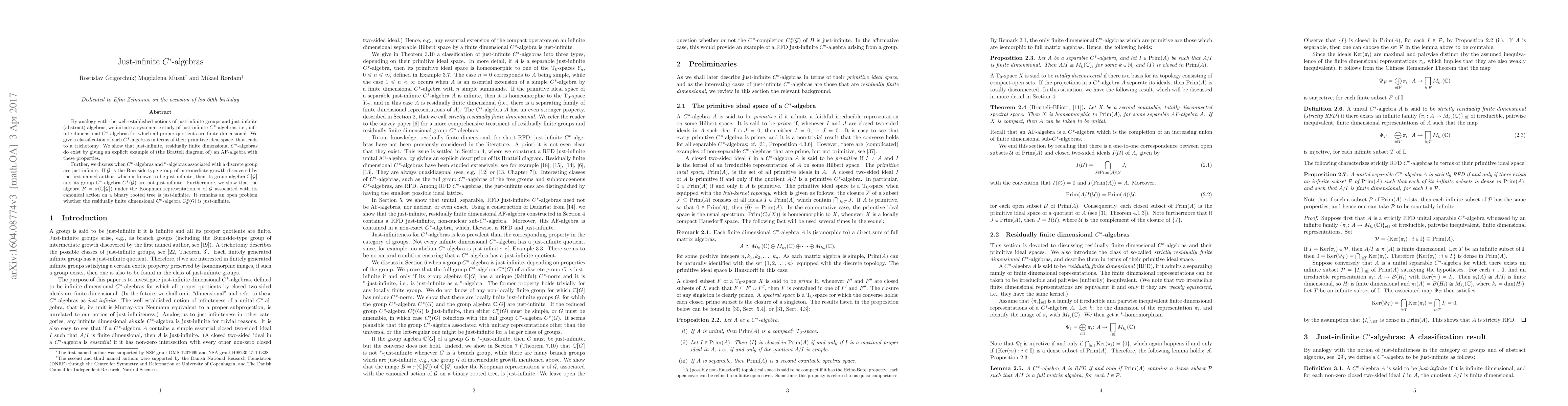This paper initiates a study of just-infinite C*-algebras, classifying them based on their primitive ideal space into three categories. It provides an example of a residually finite dimensional AF-algebra demonstrating the existence of such algebras and discusses the just-infinite nature of C*-algebras associated with discrete groups, particularly highlighting the non-just-infiniteness of $C[G]$ and $C^*(G)$ for a specific Burnside-type group.