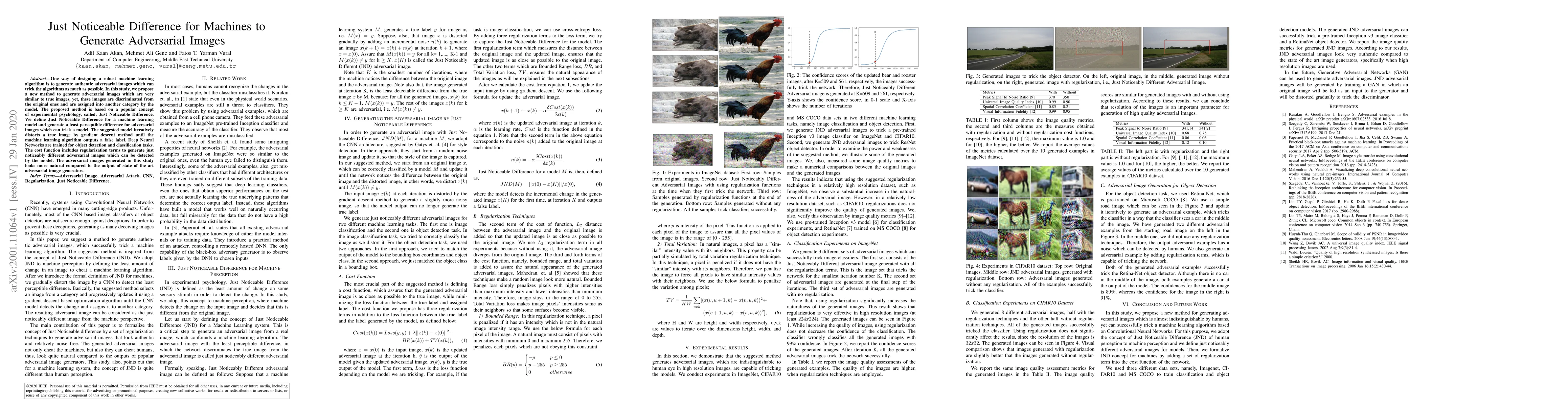 One way of designing a robust machine learning algorithm is to generate authentic adversarial images which can trick the algorithms as much as possible. In this study, we propose a new method to generate adversarial images which are very similar to true images, yet, these images are discriminated from the original ones and are assigned into another category by the model. The proposed method is based on a popular concept of experimental psychology, called, Just Noticeable Difference. We define Just Noticeable Difference for a machine learning model and generate a least perceptible difference for adversarial images which can trick a model. The suggested model iteratively distorts a true image by gradient descent method until the machine learning algorithm outputs a false label. Deep Neural Networks are trained for object detection and classification tasks. The cost function includes regularization terms to generate just noticeably different adversarial images which can be detected by the model. The adversarial images generated in this study looks more natural compared to the output of state of the art adversarial image generators.