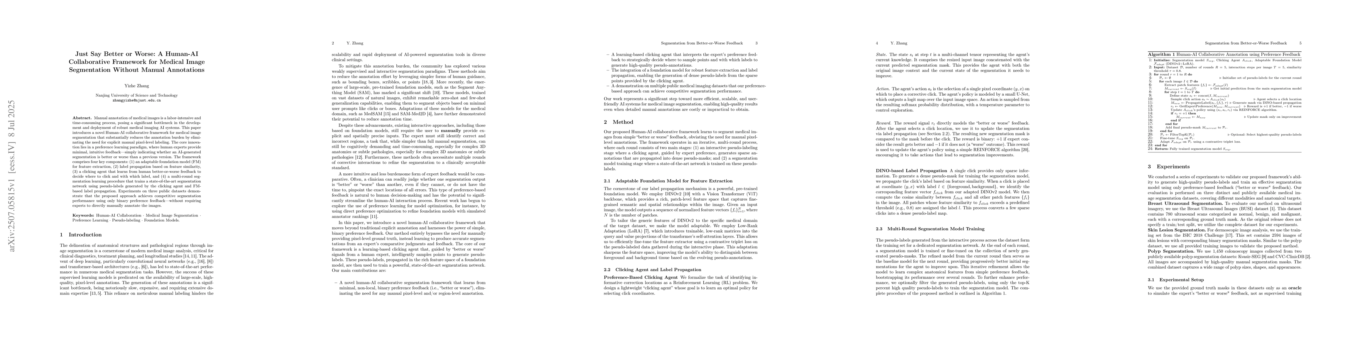 Manual annotation of medical images is a labor-intensive and time-consuming process, posing a significant bottleneck in the development and deployment of robust medical imaging AI systems. This paper introduces a novel Human-AI collaborative framework for medical image segmentation that substantially reduces the annotation burden by eliminating the need for explicit manual pixel-level labeling. The core innovation lies in a preference learning paradigm, where human experts provide minimal, intuitive feedback -- simply indicating whether an AI-generated segmentation is better or worse than a previous version. The framework comprises four key components: (1) an adaptable foundation model (FM) for feature extraction, (2) label propagation based on feature similarity, (3) a clicking agent that learns from human better-or-worse feedback to decide where to click and with which label, and (4) a multi-round segmentation learning procedure that trains a state-of-the-art segmentation network using pseudo-labels generated by the clicking agent and FM-based label propagation. Experiments on three public datasets demonstrate that the proposed approach achieves competitive segmentation performance using only binary preference feedback, without requiring experts to directly manually annotate the images.