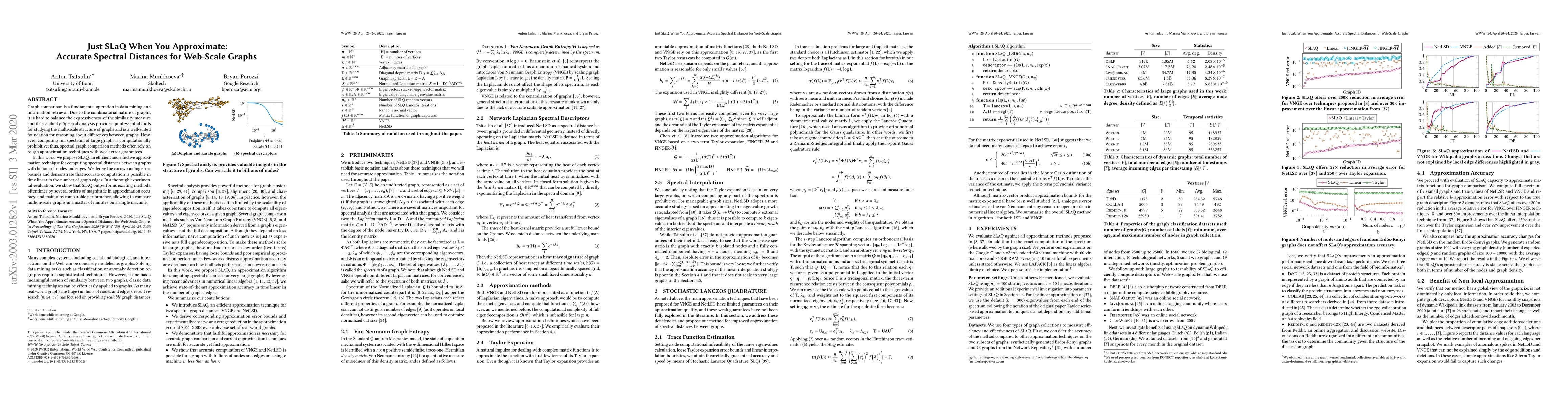 Graph comparison is a fundamental operation in data mining and information retrieval. Due to the combinatorial nature of graphs, it is hard to balance the expressiveness of the similarity measure and its scalability. Spectral analysis provides quintessential tools for studying the multi-scale structure of graphs and is a well-suited foundation for reasoning about differences between graphs. However, computing full spectrum of large graphs is computationally prohibitive; thus, spectral graph comparison methods often rely on rough approximation techniques with weak error guarantees. In this work, we propose SLaQ, an efficient and effective approximation technique for computing spectral distances between graphs with billions of nodes and edges. We derive the corresponding error bounds and demonstrate that accurate computation is possible in time linear in the number of graph edges. In a thorough experimental evaluation, we show that SLaQ outperforms existing methods, oftentimes by several orders of magnitude in approximation accuracy, and maintains comparable performance, allowing to compare million-scale graphs in a matter of minutes on a single machine.