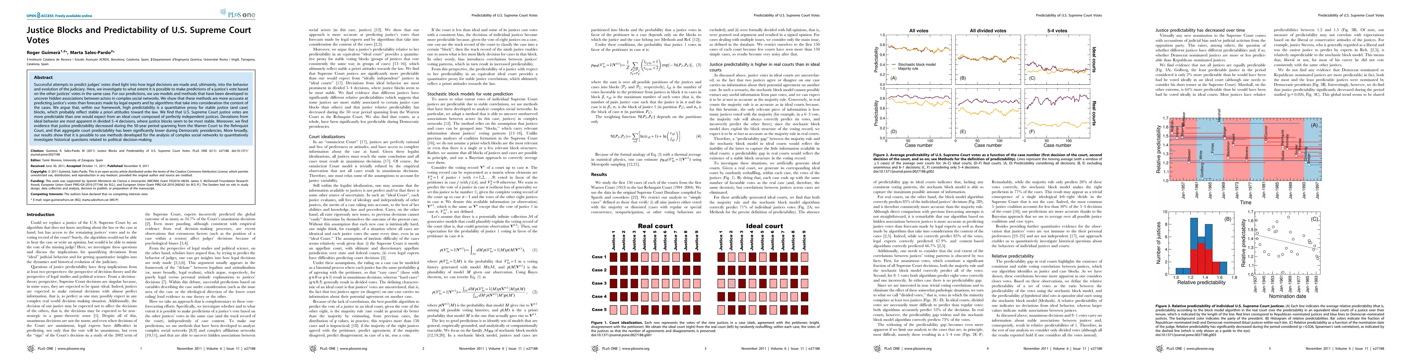 Successful attempts to predict judges' votes shed light into how legal decisions are made and, ultimately, into the behavior and evolution of the judiciary. Here, we investigate to what extent it is possible to make predictions of a justice's vote based on the other justices' votes in the same case. For our predictions, we use models and methods that have been developed to uncover hidden associations between actors in complex social networks. We show that these methods are more accurate at predicting justice's votes than forecasts made by legal experts and by algorithms that take into consideration the content of the cases. We argue that, within our framework, high predictability is a quantitative proxy for stable justice (and case) blocks, which probably reflect stable a priori attitudes toward the law. We find that U. S. Supreme Court justice votes are more predictable than one would expect from an ideal court composed of perfectly independent justices. Deviations from ideal behavior are most apparent in divided 5-4 decisions, where justice blocks seem to be most stable. Moreover, we find evidence that justice predictability decreased during the 50-year period spanning from the Warren Court to the Rehnquist Court, and that aggregate court predictability has been significantly lower during Democratic presidencies. More broadly, our results show that it is possible to use methods developed for the analysis of complex social networks to quantitatively investigate historical questions related to political decision-making.