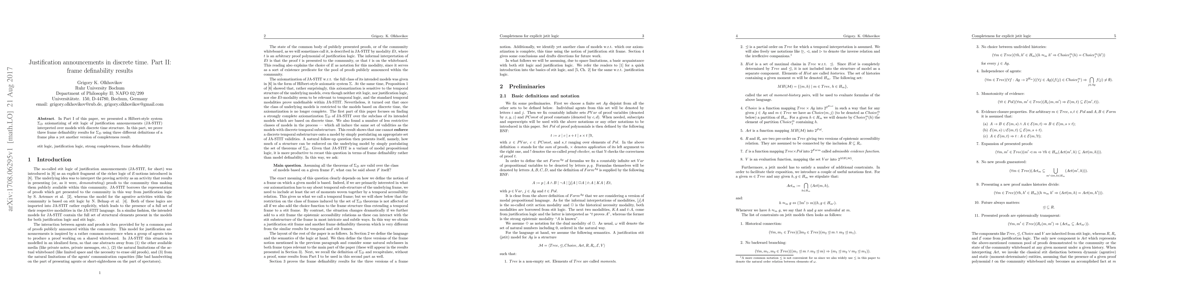 In Part I of this paper, we presented a Hilbert-style system $\Sigma_D$ axiomatizing of stit logic of justification announcements (JA-STIT) interpreted over models with discrete time structure. In this part, we prove three frame definability results for $\Sigma_D$ using three different definitions of a frame plus a yet another version of completeness result.