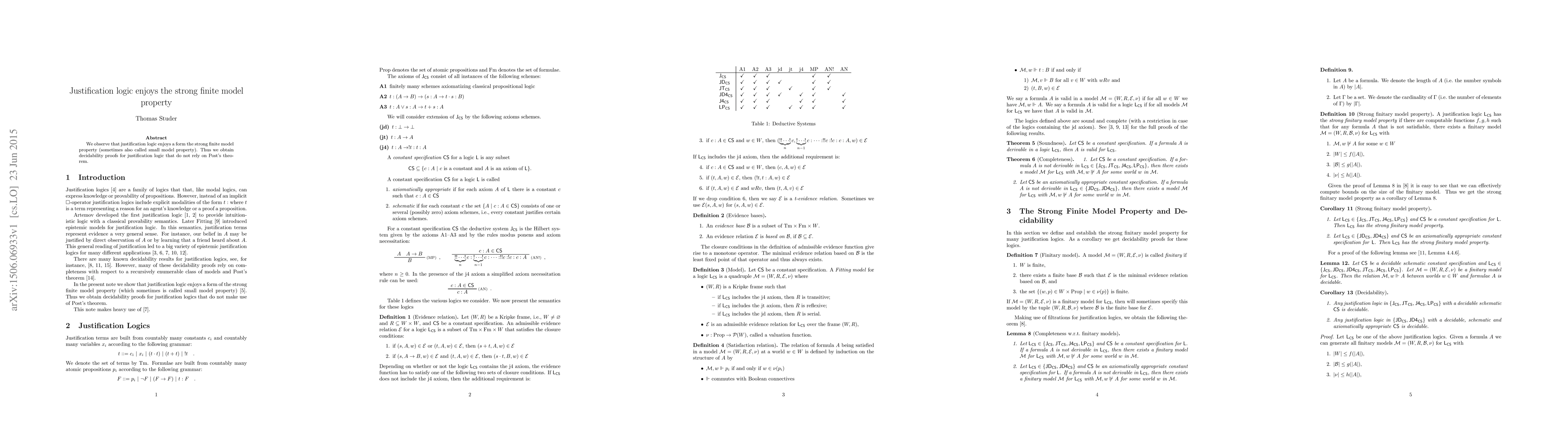 Summary: This paper demonstrates that justification logic possesses a strong finite model property, leading to decidability proofs that do not depend on Post's theorem. This finding provides an alternative method for establishing the decidability of justification logic.