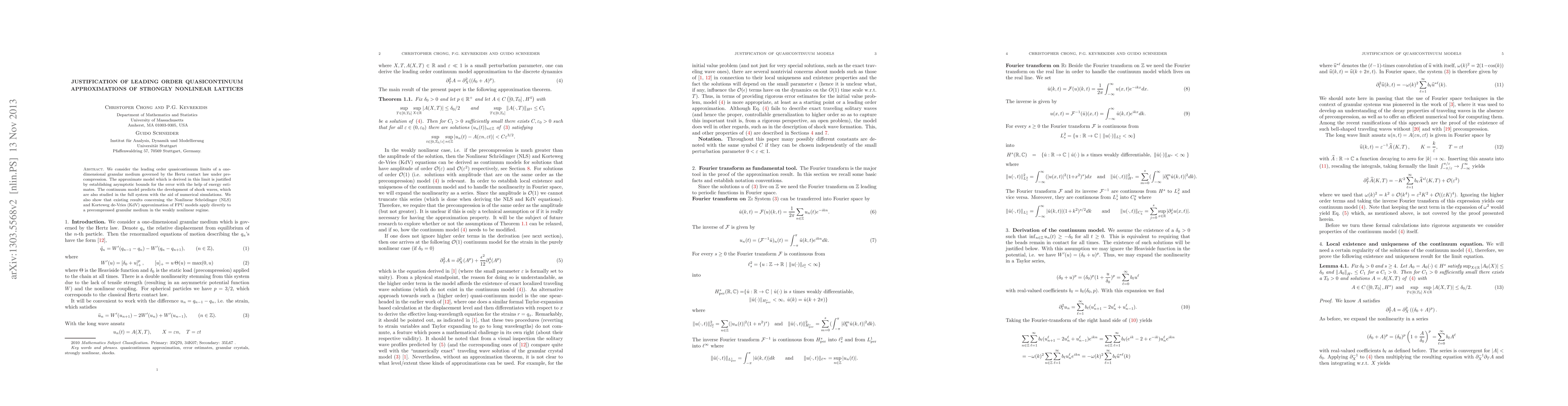 We consider the leading order quasicontinuum limits of a one-dimensional granular medium governed by the Hertz contact law under precompression. The approximate model which is derived in this limit is justified by establishing asymptotic bounds for the error with the help of energy estimates. The continuum model predicts the development of shock waves, which are also studied in the full system with the aid of numerical simulations. We also show that existing results concerning the Nonlinear Schrodinger (NLS) and Korteweg de-Vries (KdV) approximation of FPU models apply directly to a precompressed granular medium in the weakly nonlinear regime.