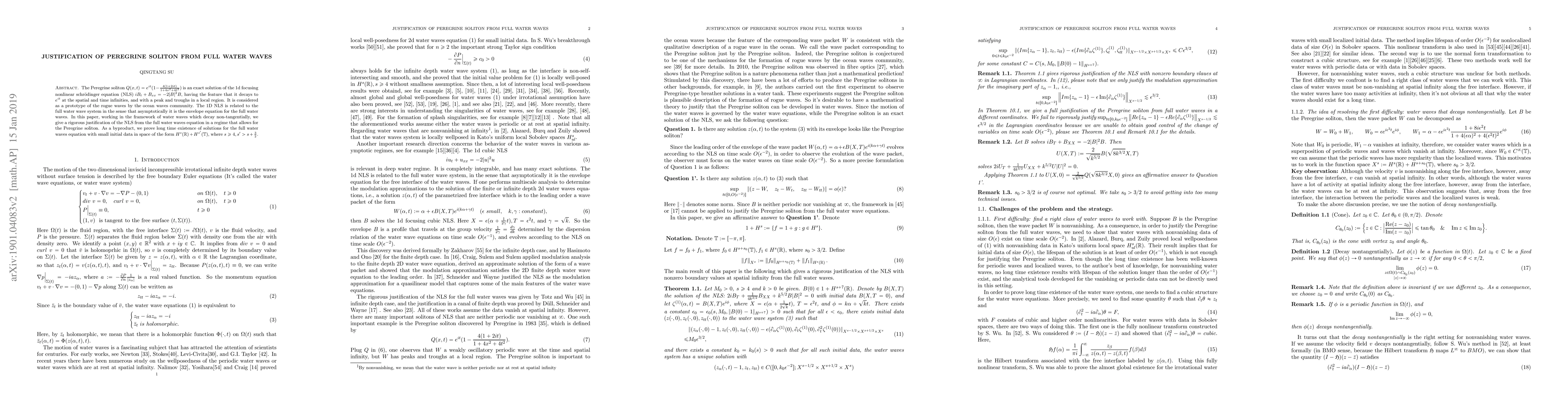 Researchers justify the Peregrine soliton as a solution to both the 1D nonlinear Schrödinger equation and the full water waves equation, demonstrating its connection to rogue waves in oceanography and proving long-time existence of solutions for small initial data.