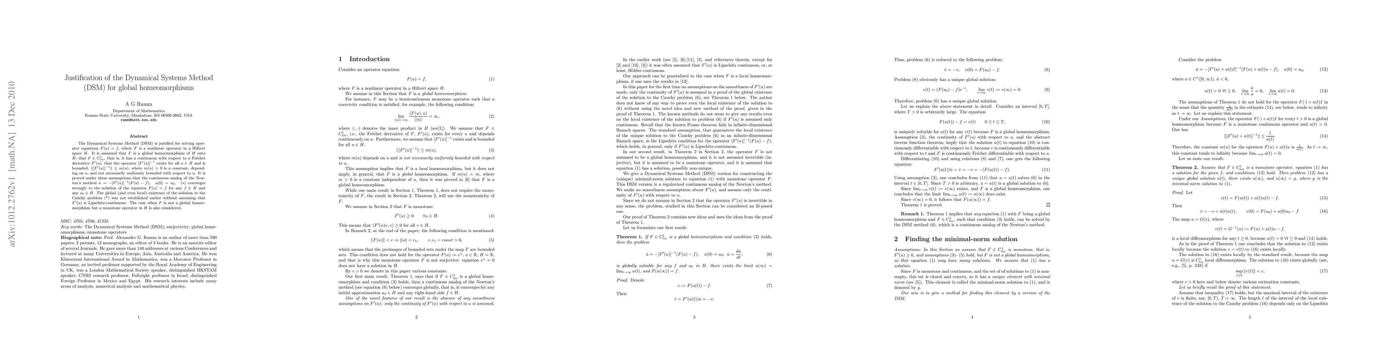 The Dynamical Systems Method (DSM) is justified for solving operator equations $F(u)=f$, where $F$ is a nonlinear operator in a Hilbert space $H$. It is assumed that $F$ is a global homeomorphism of $H$ onto $H$, that $F\in C^1_{loc}$, that is, it has a continuous with respect to $u$ Fr\'echet derivative $F'(u)$, that the operator $[F'(u)]^{-1}$ exists for all $u\in H$ and is bounded, $||[F'(u)]^{-1}||\leq m(u)$, where $m(u)>0$ is a constant, depending on $u$, and not necessarily uniformly bounded with respect to $u$. It is proved under these assumptions that the continuous analog of the Newton's method $\dot{u}=-[F'(u)]^{-1}(F(u)-f), \quad u(0)=u_0, \quad (*)$ converges strongly to the solution of the equation $F(u)=f$ for any $f\in H$ and any $u_0\in H$. The global (and even local) existence of the solution to the Cauchy problem (*) was not established earlier without assuming that $F'(u)$ is Lipschitz-continuous. The case when $F$ is not a global homeomorphism but a monotone operator in $H$ is also considered.