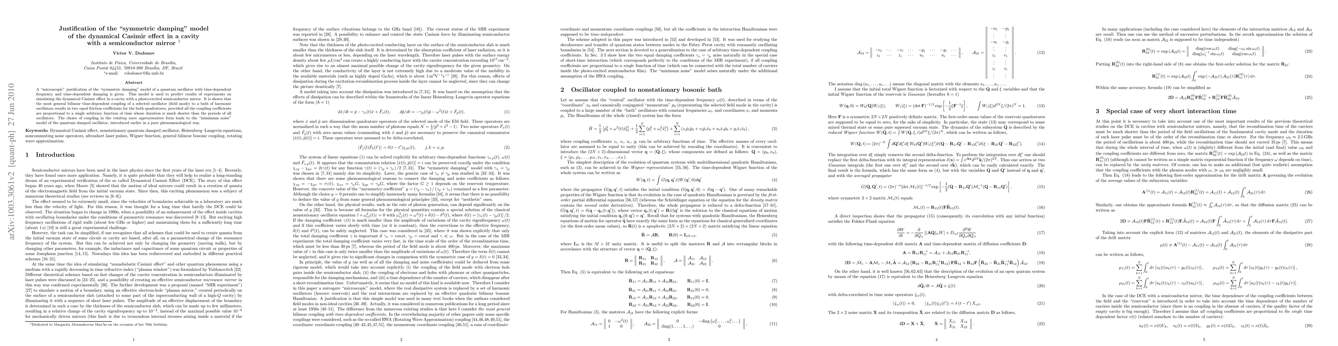 This paper provides a microscopic justification for the symmetric damping model of a quantum oscillator, demonstrating that it predicts the dynamical Casimir effect in a cavity with a photo-excited semiconductor mirror. It shows that equal friction coefficients for both quadratures arise from a general bilinear time-dependent coupling, supporting the minimum noise model.