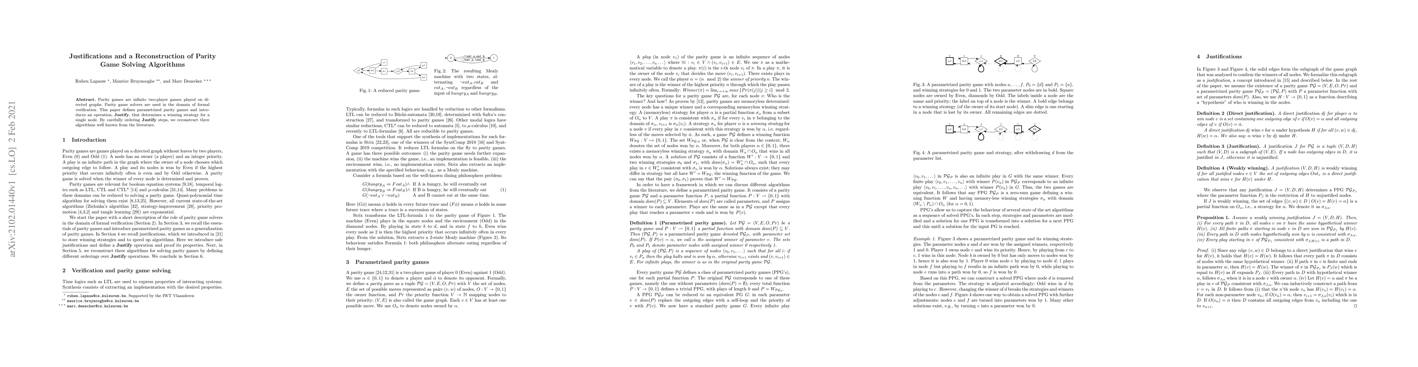 This paper introduces a novel operation, Justify, to determine winning strategies for nodes in parametrized parity games, and reconstructs three well-known algorithms by carefully ordering the Justify steps. The focus is on formal verification applications.