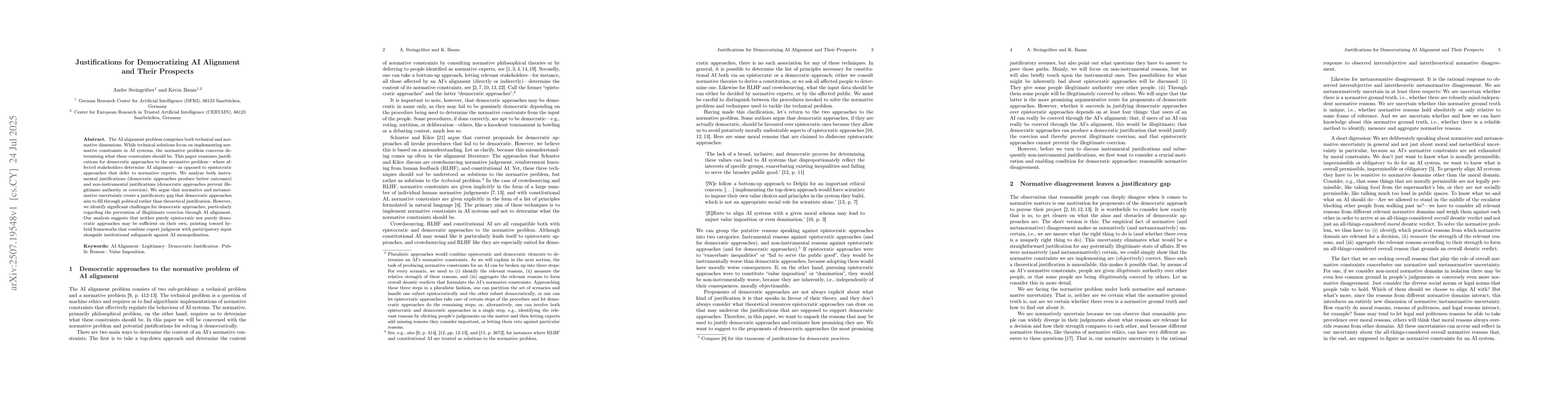 The AI alignment problem comprises both technical and normative dimensions. While technical solutions focus on implementing normative constraints in AI systems, the normative problem concerns determining what these constraints should be. This paper examines justifications for democratic approaches to the normative problem -- where affected stakeholders determine AI alignment -- as opposed to epistocratic approaches that defer to normative experts. We analyze both instrumental justifications (democratic approaches produce better outcomes) and non-instrumental justifications (democratic approaches prevent illegitimate authority or coercion). We argue that normative and metanormative uncertainty create a justificatory gap that democratic approaches aim to fill through political rather than theoretical justification. However, we identify significant challenges for democratic approaches, particularly regarding the prevention of illegitimate coercion through AI alignment. Our analysis suggests that neither purely epistocratic nor purely democratic approaches may be sufficient on their own, pointing toward hybrid frameworks that combine expert judgment with participatory input alongside institutional safeguards against AI monopolization.