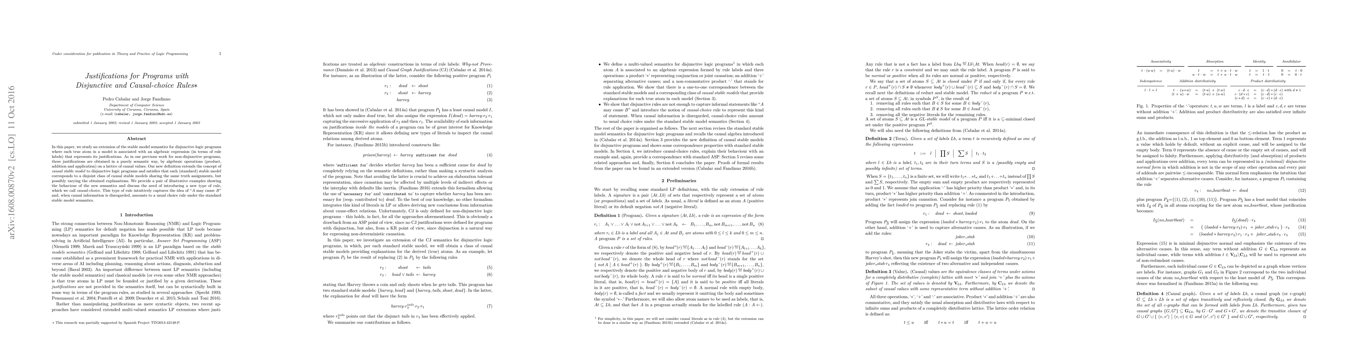 This paper extends stable model semantics to disjunctive logic programs, associating true atoms with algebraic expressions representing justifications derived from a lattice of causal values. It introduces causal-choice rules that capture causal relationships and generalize choice rules in standard semantics.