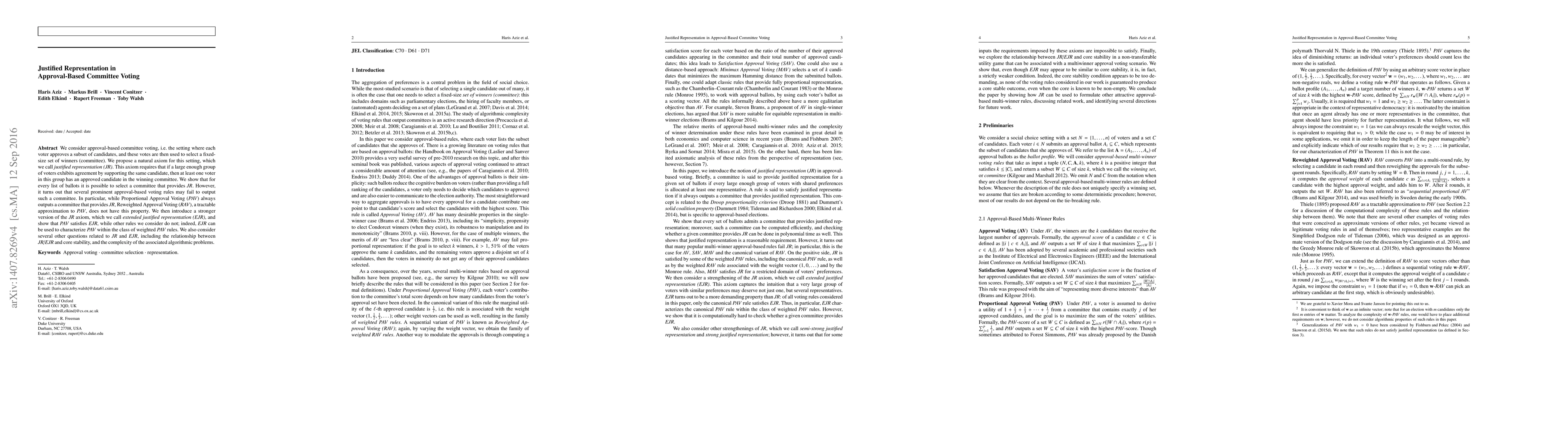This paper proposes a new axiom called justified representation (JR) for approval-based committee voting, ensuring that a committee reflects the support of a sufficiently large group of voters. It demonstrates that while Proportional Approval Voting (PAV) always satisfies JR, Reweighted Approval Voting (RAV) does not, and introduces a stronger version, extended justified representation (EJR), which PAV satisfies but other methods do not.
