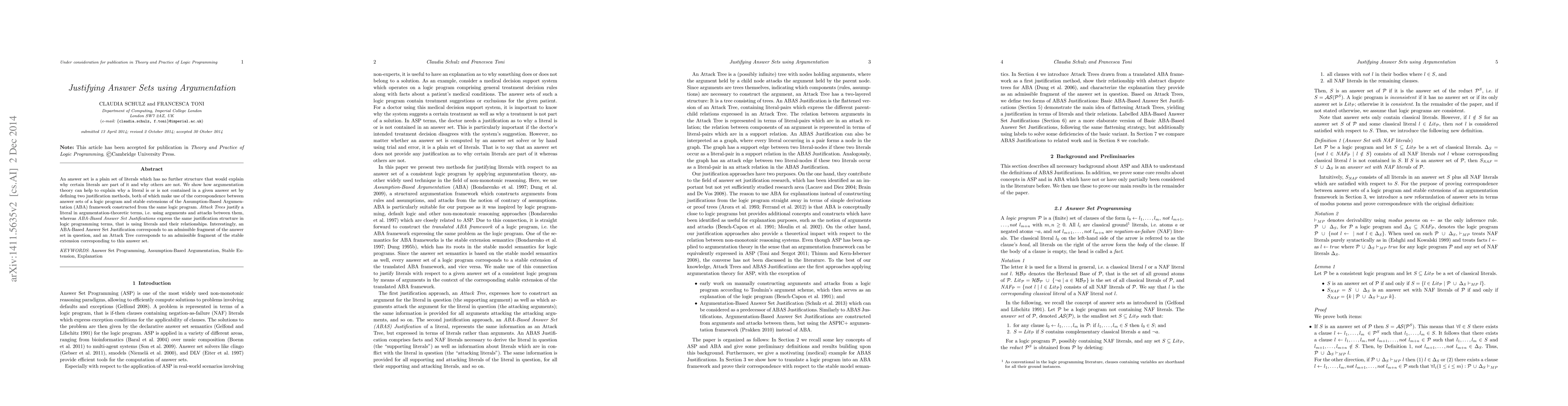 An answer set is a plain set of literals which has no further structure that would explain why certain literals are part of it and why others are not. We show how argumentation theory can help to explain why a literal is or is not contained in a given answer set by defining two justification methods, both of which make use of the correspondence between answer sets of a logic program and stable extensions of the Assumption-Based Argumentation (ABA) framework constructed from the same logic program. Attack Trees justify a literal in argumentation-theoretic terms, i.e. using arguments and attacks between them, whereas ABA-Based Answer Set Justifications express the same justification structure in logic programming terms, that is using literals and their relationships. Interestingly, an ABA-Based Answer Set Justification corresponds to an admissible fragment of the answer set in question, and an Attack Tree corresponds to an admissible fragment of the stable extension corresponding to this answer set.