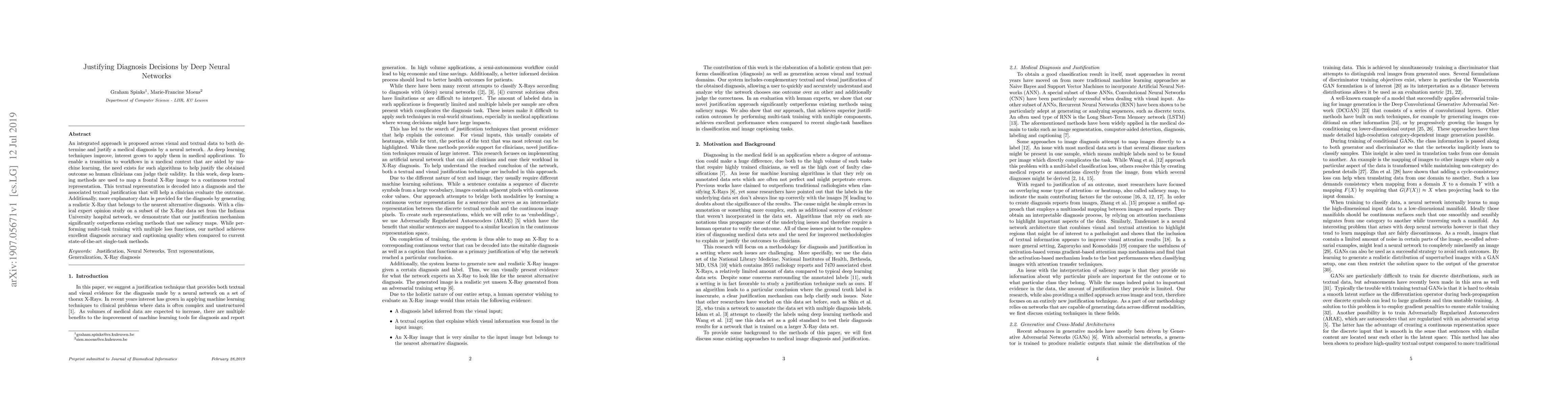 An integrated approach is proposed across visual and textual data to both determine and justify a medical diagnosis by a neural network. As deep learning techniques improve, interest grows to apply them in medical applications. To enable a transition to workflows in a medical context that are aided by machine learning, the need exists for such algorithms to help justify the obtained outcome so human clinicians can judge their validity. In this work, deep learning methods are used to map a frontal X-Ray image to a continuous textual representation. This textual representation is decoded into a diagnosis and the associated textual justification that will help a clinician evaluate the outcome. Additionally, more explanatory data is provided for the diagnosis by generating a realistic X-Ray that belongs to the nearest alternative diagnosis. With a clinical expert opinion study on a subset of the X-Ray data set from the Indiana University hospital network, we demonstrate that our justification mechanism significantly outperforms existing methods that use saliency maps. While performing multi-task training with multiple loss functions, our method achieves excellent diagnosis accuracy and captioning quality when compared to current state-of-the-art single-task methods.