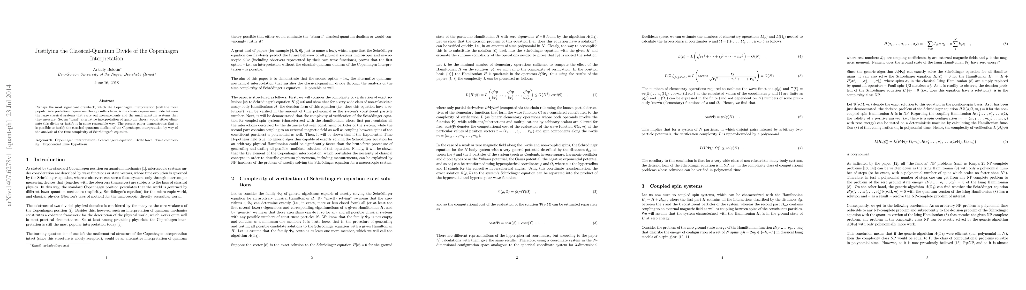 Perhaps the most significant drawback, which the Copenhagen interpretation (still the most popular interpretation of quantum theory) suffers from, is the classical-quantum divide between the large classical systems that carry out measurements and the small quantum systems that they measure. So, an "ideal" alternative interpretation of quantum theory would either eliminate this divide or justify it in some reasonable way. The present paper demonstrates that it is possible to justify the classical-quantum dualism of the Copenhagen interpretation by way of the analysis of the time complexity of Schrodinger's equation.