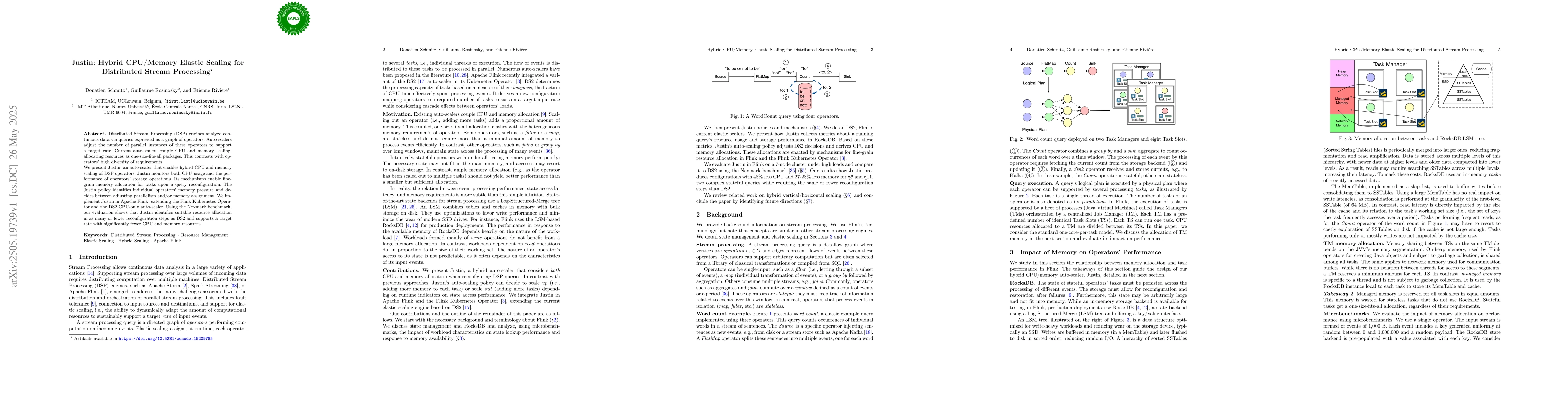 The paper presents Justin, an auto-scaler for Distributed Stream Processing (DSP) engines that enables hybrid CPU and memory scaling of operators by monitoring CPU usage and operator storage operation performance.