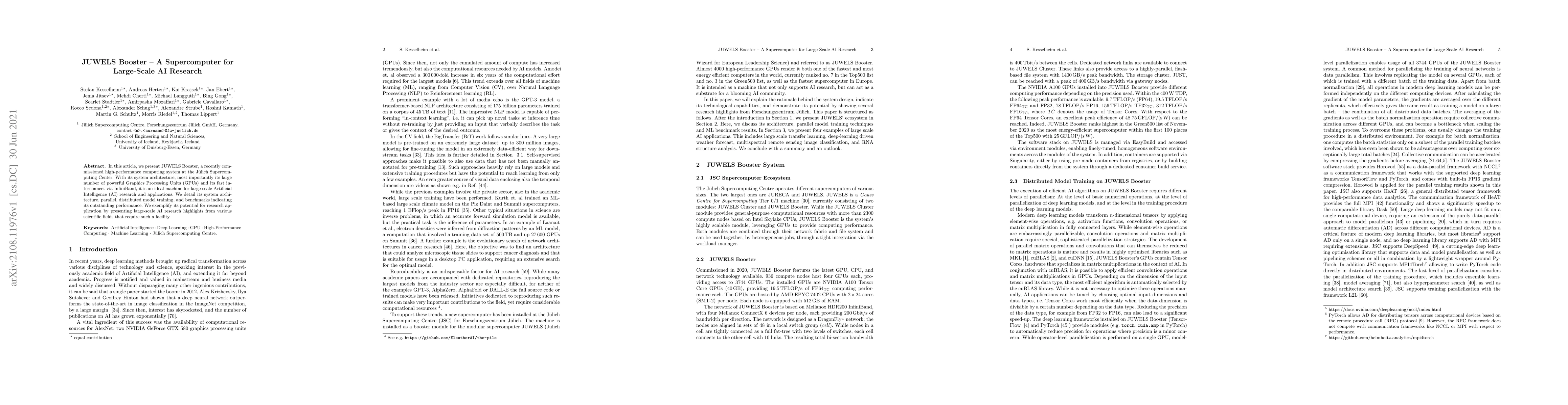 JUWELS Booster is a high-performance supercomputer at the Jülich Supercomputing Center, equipped with numerous GPUs and an InfiniBand interconnect, ideal for large-scale AI research. It showcases exceptional performance in parallel, distributed AI model training and has been utilized for significant AI research across various scientific domains.