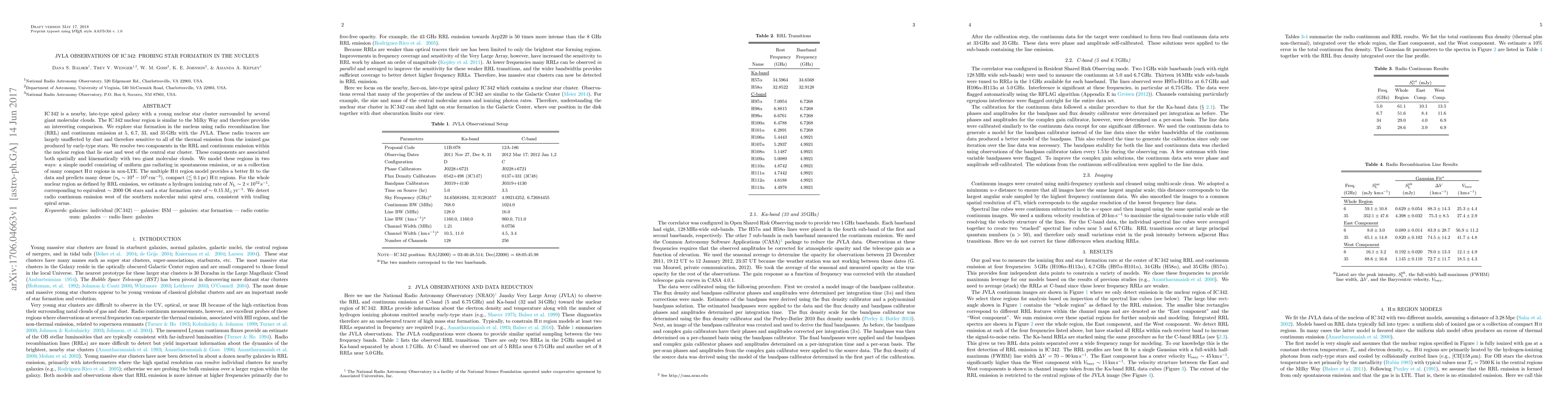 The research utilizes JVLA observations to study star formation in IC342's nucleus, revealing two ionized gas components linked to giant molecular clouds. Modeling suggests numerous dense, compact HII regions, estimating an ionizing rate equivalent to ~2000 O6 stars and a star formation rate of ~0.15 Msun/year. It also detects radio continuum emission consistent with trailing spiral arms.