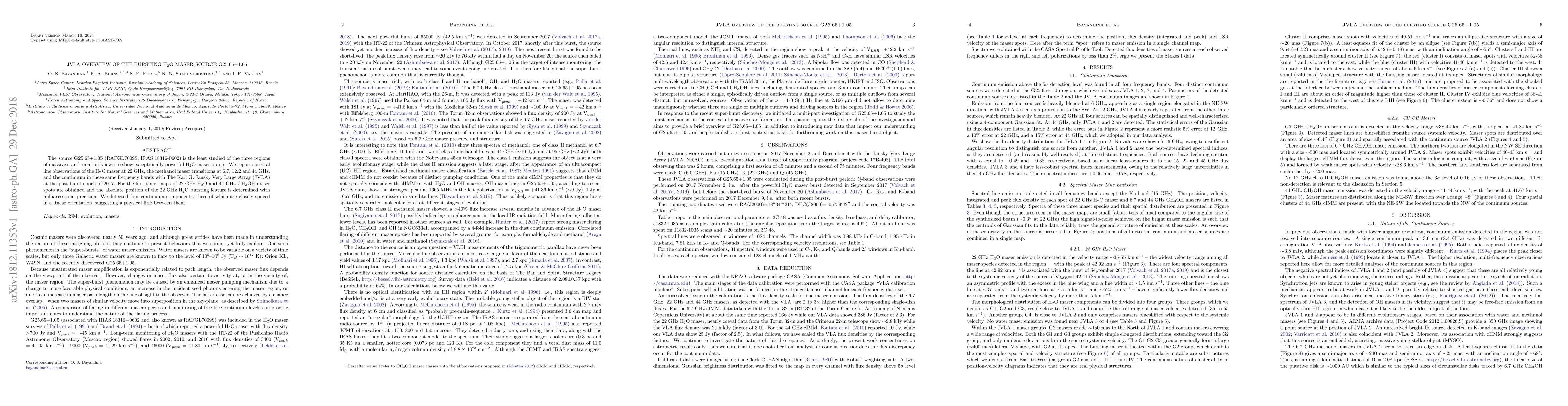The source G25.65+1.05 (RAFGL7009S, IRAS 18316-0602) is the least studied of the three regions of massive star formation known to show exceptionally powerful H$_2$O maser bursts. We report spectral line observations of the H$_2$O maser at 22 GHz, the methanol maser transitions at 6.7, 12.2 and 44 GHz, and the continuum in these same frequency bands with The Karl G. Jansky Very Large Array (JVLA) at the post-burst epoch of 2017. For the first time, maps of 22 GHz H$_2$O and 44 GHz CH$_3$OH maser spots are obtained and the absolute position of the 22 GHz H$_2$O bursting feature is determined with milliarcsecond precision. We detected four continuum components, three of which are closely spaced in a linear orientation, suggesting a physical link between them.