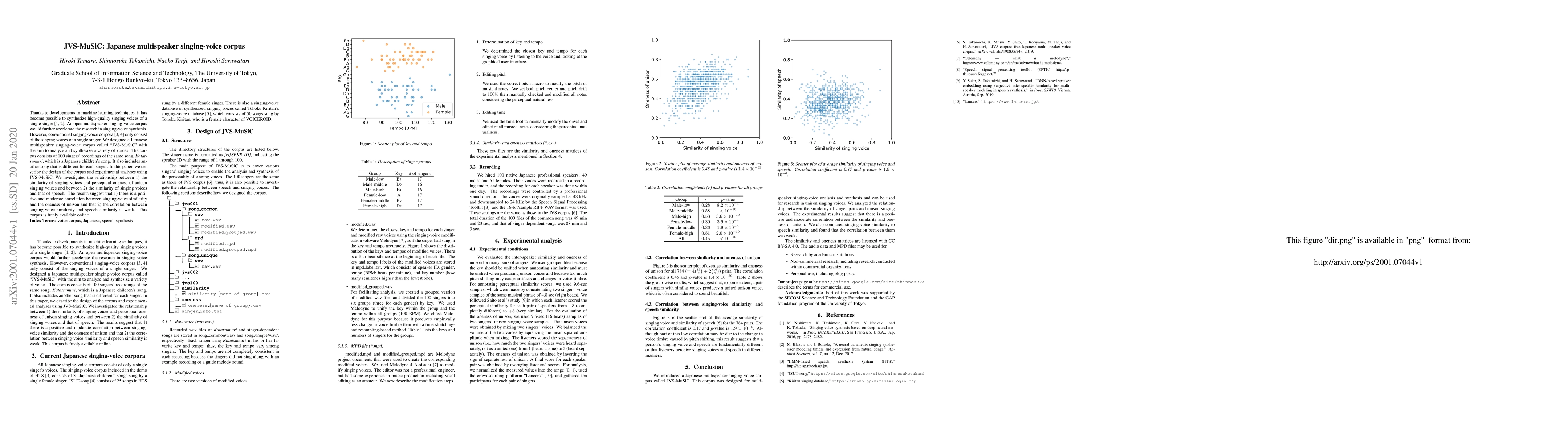 The JVS-MuSiC corpus, a Japanese multispeaker singing-voice dataset, aims to advance singing-voice synthesis research. It includes recordings from 100 singers performing two songs, revealing moderate correlation between singing-voice similarity and unison oneness, and weak correlation with speech similarity.