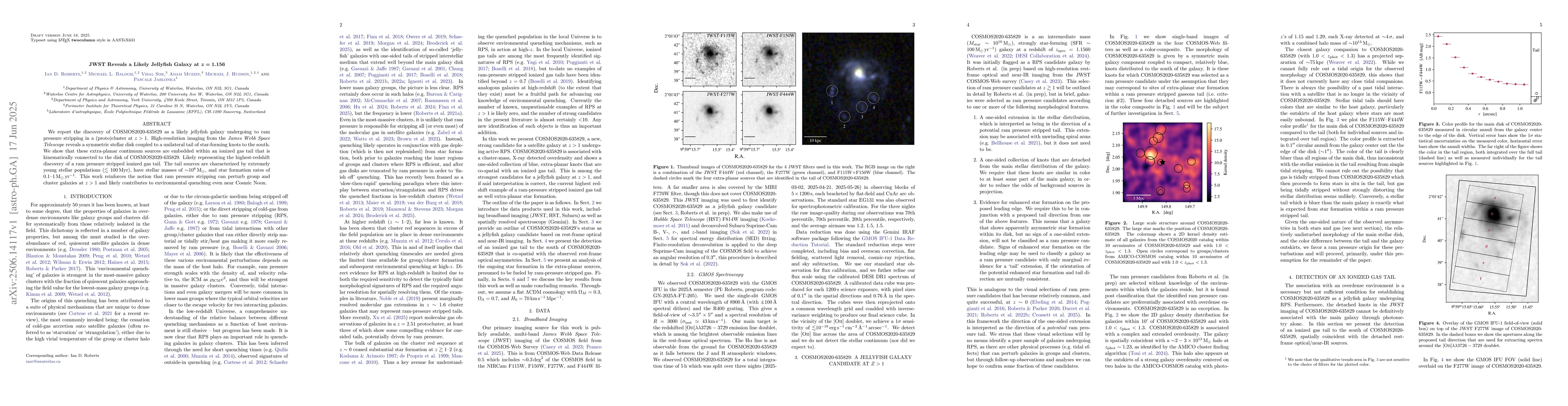 We report the discovery of COSMOS2020-635829 as a likely jellyfish galaxy undergoing to ram pressure stripping in a (proto)cluster at $z > 1$. High-resolution imaging from the James Webb Space Telescope reveals a symmetric stellar disk coupled to a unilateral tail of star-forming knots to the south. We show that these extra-planar continuum sources are embedded within an ionized gas tail that is kinematically connected to the disk of COSMOS2020-635829. Likely representing the highest-redshift discovery of a ram pressure stripped ionized gas tail. The tail sources are characterized by extremely young stellar populations ($\lesssim 100\,\mathrm{Myr}$), have stellar masses of ${\sim}10^8\,\mathrm{M_\odot}$, and star formation rates of $0.1\text{--}1\,\mathrm{M_\odot\,yr^{-1}}$. This work reinforces the notion that ram pressure stripping can perturb group and cluster galaxies at $z > 1$ and likely contributes to environmental quenching even near Cosmic Noon.