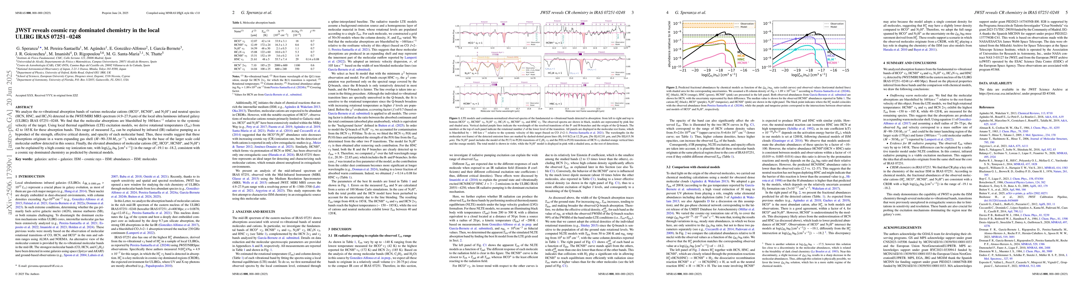 We analyze the ro-vibrational absorption bands of various molecular cations (HCO$^+$, HCNH$^+$, and N$_2$H$^+$) and neutral species (HCN, HNC, and HC$_3$N) detected in the JWST/MIRI MRS spectrum (4.9-27.9 $\mu$m) of the local ultra luminous infrared galaxy (ULIRG) IRAS~07251$-$0248. We find that the molecular absorptions are blueshifted by 160 km s$^{-1}$ relative to the systemic velocity of the target. Using local thermal equilibrium (LTE) excitation models, we derive rotational temperatures ($T_{\rm rot}$) from 42 to 185 K for these absorption bands. This range of measured $T_{\rm rot}$ can be explained by infrared (IR) radiative pumping as a byproduct of the strength, effective critical density, and opacity of each molecular band. Thus, these results suggest that these absorptions originate in a warm expanding gas shell ($\dot{M}$$\sim$90-330 $M_\odot$ yr$^{-1}$), which might be the base of the larger scale cold molecular outflow detected in this source. Finally, the elevated abundance of molecular cations (H$_3^+$, HCO$^+$, HCNH$^+$, and N$_2$H$^+$) can be explained by a high cosmic ray ionization rate, with log($\zeta_{\text{H}_2}$/n$_{\rm H}\, [\text{cm}^3 \text{s}^{-1}])$ in the range of -19.1 to -18.2, consistent with a cosmic ray dominated chemistry as predicted by chemical models.