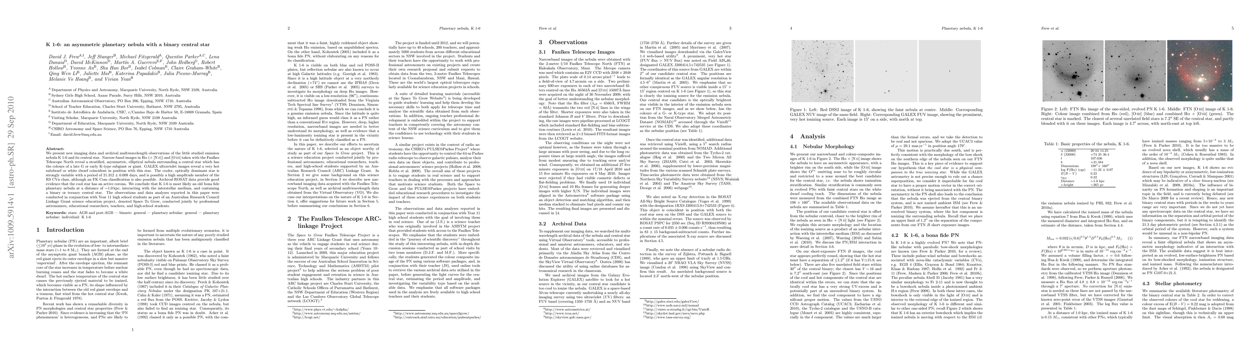We present new imaging data and archival multiwavelength observations of the little studied emission nebula K 1-6 and its central star. Narrow-band images in H-alpha (+ [NII]) and [OIII] taken with the Faulkes Telescope North reveal a stratified, asymmetric, elliptical nebula surrounding a central star which has the colours of a late G- or early K-type subgiant or giant. GALEX ultraviolet images reveal a very hot subdwarf or white dwarf coincident in position with this star. The cooler, optically dominant star is strongly variable with a period of 21.312 +/- 0.008 days, and is possibly a high amplitude member of the RS CVn class, although an FK Com classification is also possible. Archival ROSAT data provide good evidence that the cool star has an active corona. We conclude that K 1-6 is most likely an old bona fide planetary nebula at a distance of ~1.0 kpc, interacting with the interstellar medium, and containing a binary or ternary central star. The observations and data analyses reported in this paper were conducted in conjunction with Year 11 high school students as part of an Australian Research Council Linkage Grant science education project, denoted Space To Grow, conducted jointly by professional astronomers, educational researchers, teachers, and high-school students.