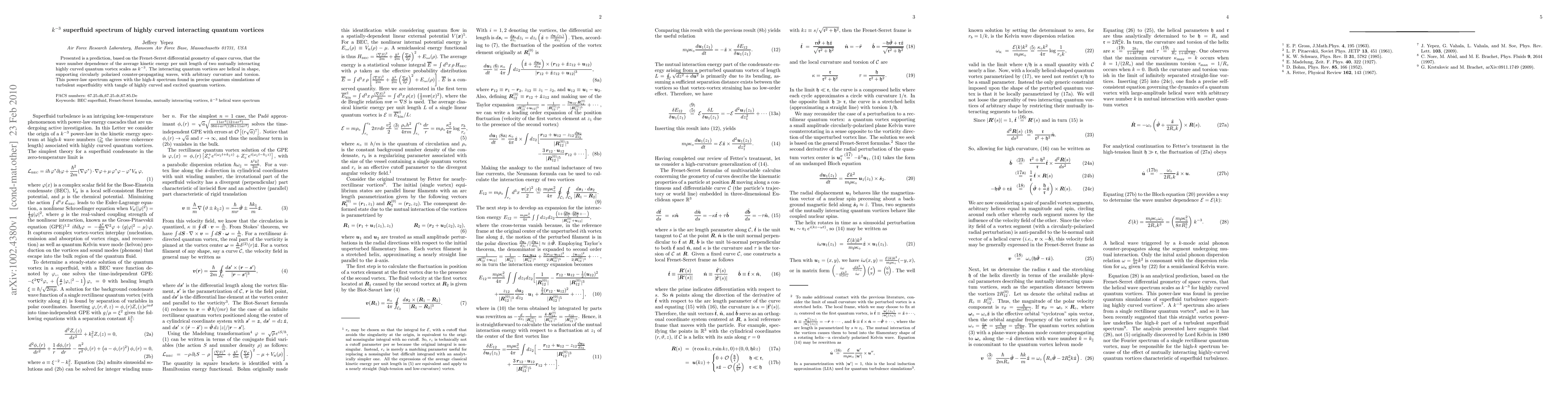 Presented is a prediction, based on the Frenet-Serret differential geometry of space curves, that the wave number dependence of the average kinetic energy per unit length of two mutually interacting highly curved quantum vortex scales as k^-3. The interacting quantum vortices are helical in shape, supporting circularly polarized counter-propagating waves, with arbitrary curvature and torsion. This power-law spectrum agrees with the high-k spectrum found in precise quantum simulations of turbulent superfluidity with tangle of highly curved and excited quantum vortices.