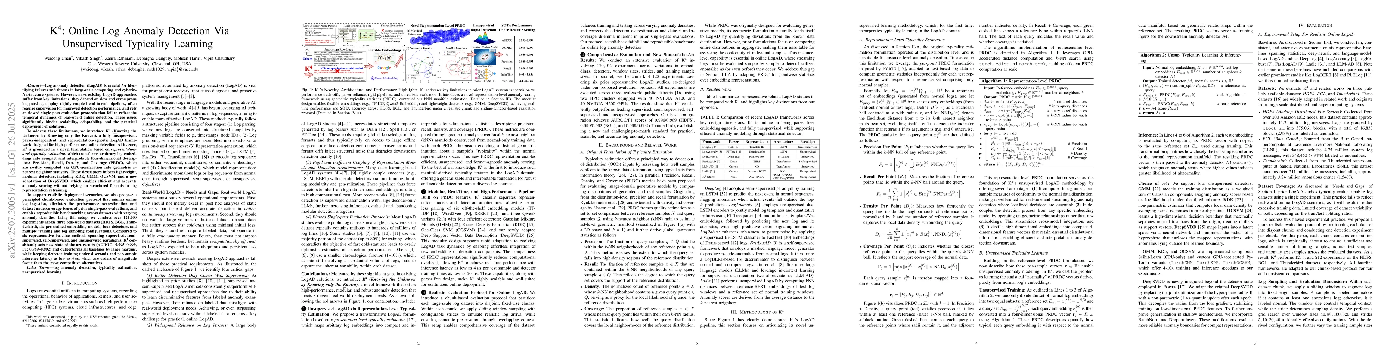 Existing Log Anomaly Detection (LogAD) methods are often slow, dependent on error-prone parsing, and use unrealistic evaluation protocols. We introduce $K^4$, an unsupervised and parser-independent framework for high-performance online detection. $K^4$ transforms arbitrary log embeddings into compact four-dimensional descriptors (Precision, Recall, Density, Coverage) using efficient k-nearest neighbor (k-NN) statistics. These descriptors enable lightweight detectors to accurately score anomalies without retraining. Using a more realistic online evaluation protocol, $K^4$ sets a new state-of-the-art (AUROC: 0.995-0.999), outperforming baselines by large margins while being orders of magnitude faster, with training under 4 seconds and inference as low as 4 $\mu$s.
