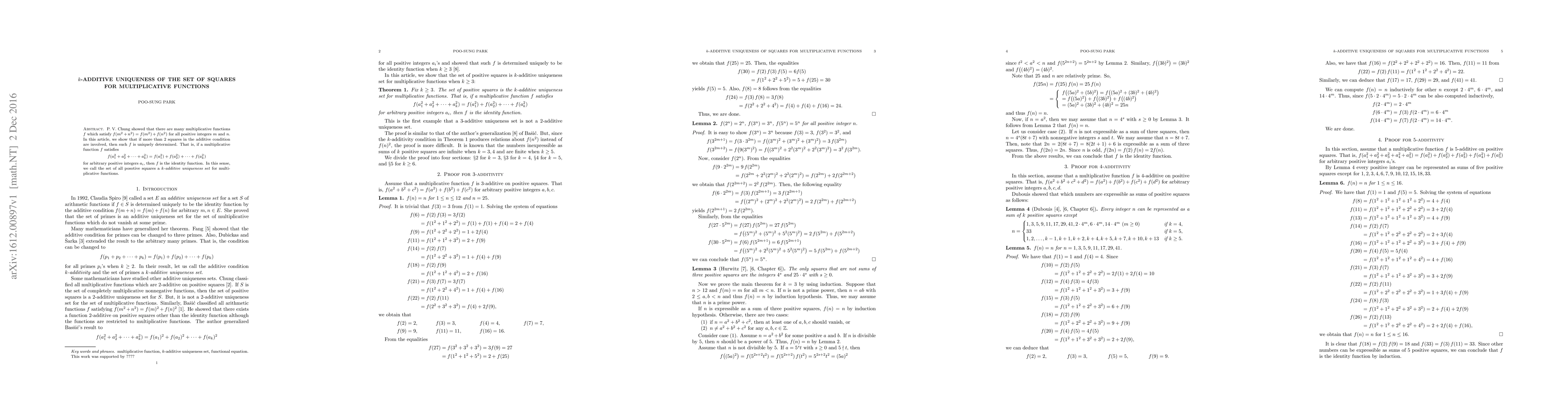 P. V. Chung showed that there are many multiplicative functions $f$ which satisfy $f(m^2+n^2) = f(m^2)+f(n^2)$ for all positive integers $m$ and $n$. In this article, we show that if more than $2$ squares in the additive condition are involved, then such $f$ is uniquely determined. That is, if a multiplicative function $f$ satisfies \[ f(a_1^2 + a_2^2 + \dotsb + a_k^2) = f(a_1^2) + f(a_2^2) + \dotsb + f(a_k^2) \] for arbitrary positive integers $a_i$, then $f$ is the identity function. In this sense, we call the set of all posotive squares a \emph{$k$-additive uniqueness set} for multiplicative functions.