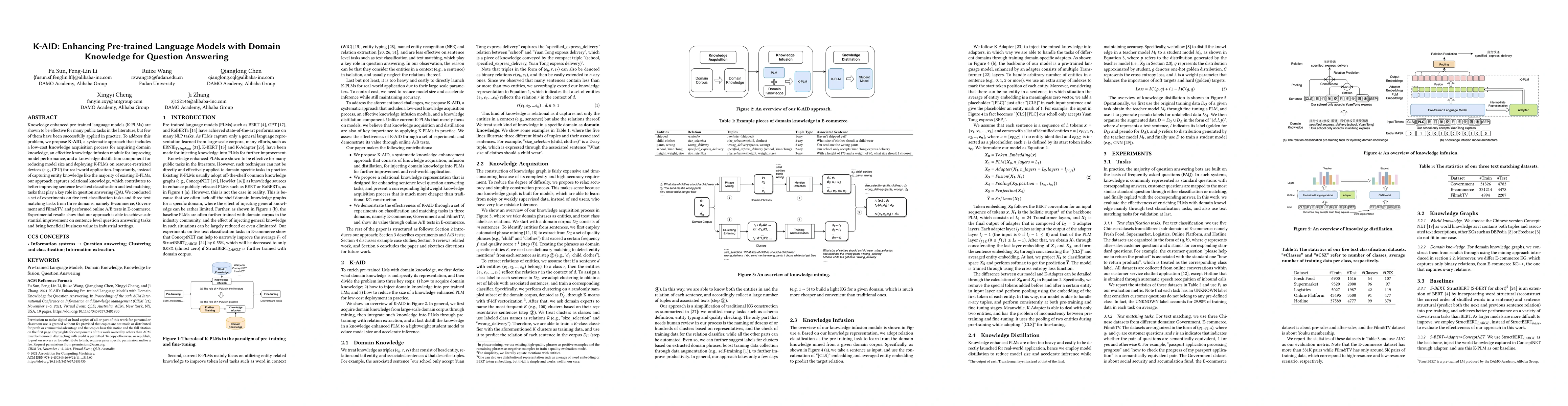 K-AID enhances pre-trained language models with domain-specific relational knowledge to improve performance on sentence-level text classification and matching tasks, crucial for question answering. Experiments across various domains demonstrate significant improvements and real-world business benefits.