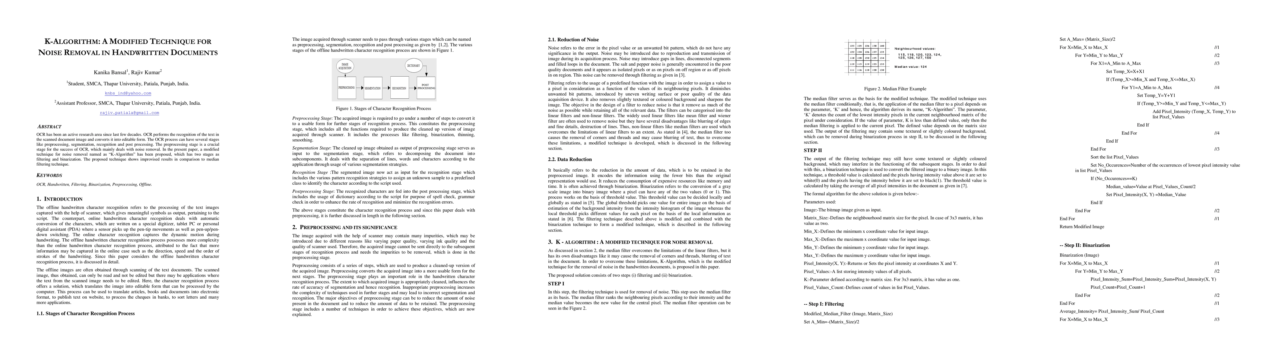 OCR has been an active research area since last few decades. OCR performs the recognition of the text in the scanned document image and converts it into editable form. The OCR process can have several stages like pre-processing, segmentation, recognition and post processing. The pre-processing stage is a crucial stage for the success of OCR, which mainly deals with noise removal. In the present paper, a modified technique for noise removal named as K-Algorithm has been proposed, which has two stages as filtering and binarization. The proposed technique shows improvised results in comparison to median filtering technique.