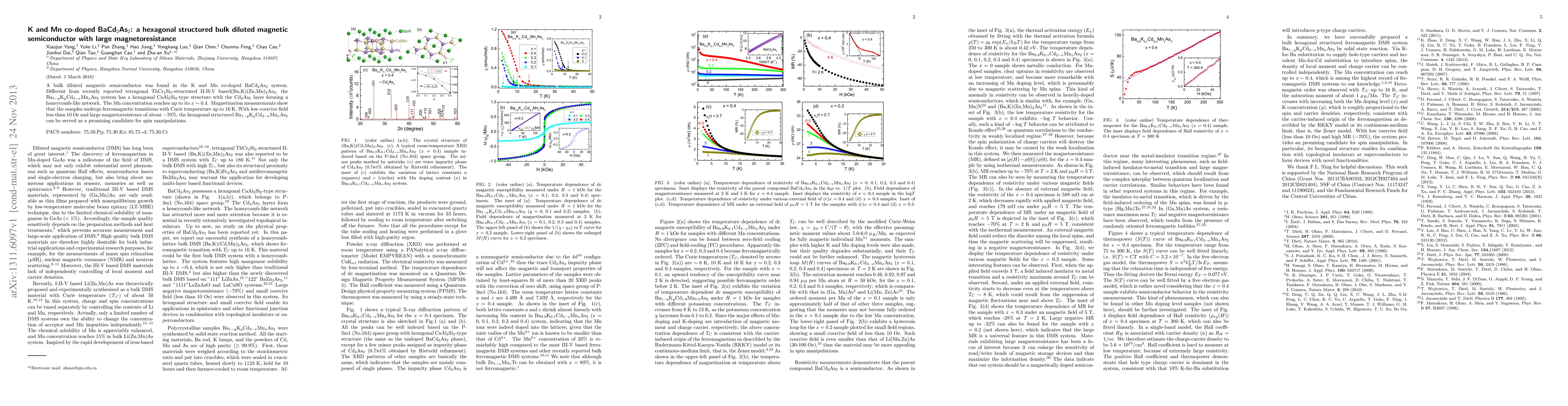 K and Mn co-doped BaCd2As2 forms a hexagonal structured bulk diluted magnetic semiconductor with a honeycomb-like Cd2As2 layer network. The material exhibits ferromagnetic transitions up to 16 K and large magnetoresistance of about -70%, making it a potential candidate for spin manipulation applications.