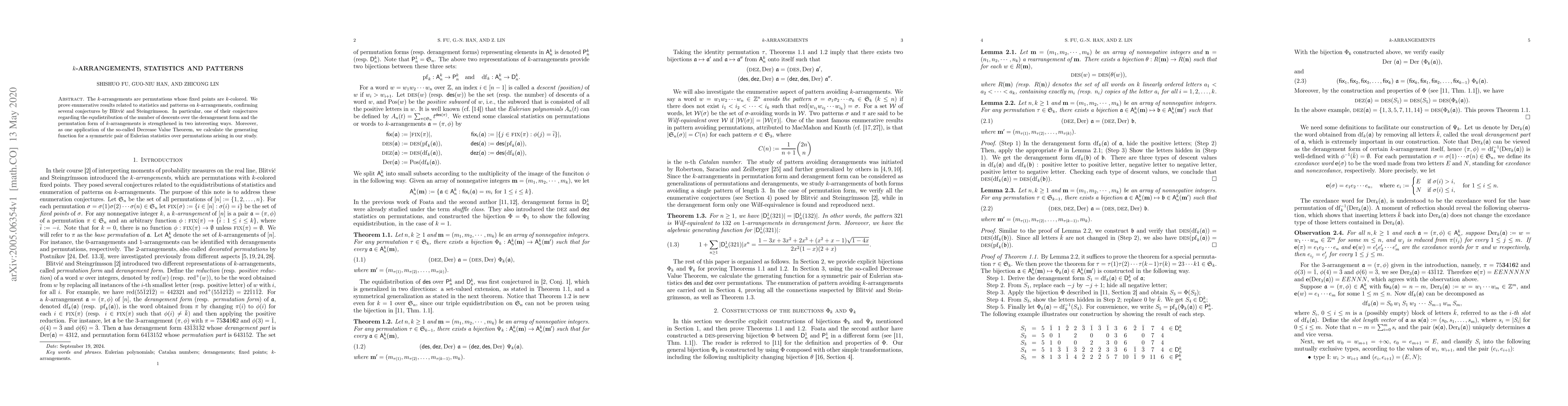 This research proves enumerative results about k-arrangements, permutations with k-colored fixed points, verifying conjectures by Blitvić and Steingrímsson. It strengthens one conjecture related to descent distribution in k-arrangements and uses the Decrease Value Theorem to calculate a generating function for Eulerian statistics over permutations.