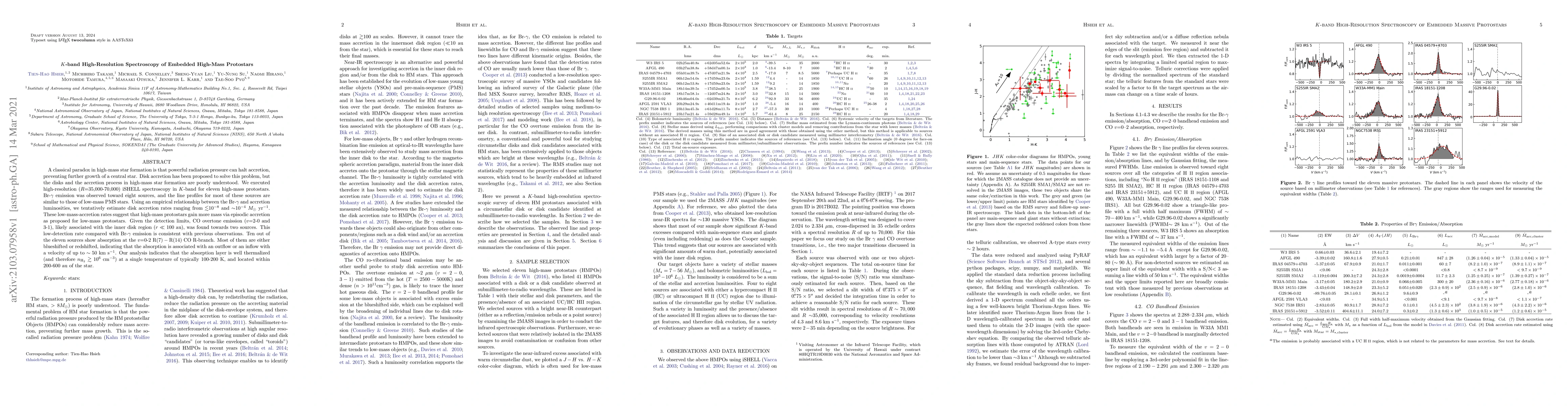 A classical paradox in high-mass star formation is that powerful radiation pressure can halt accretion, preventing further growth of a central star. Disk accretion has been proposed to solve this problem, but the disks and the accretion process in high-mass star formation are poorly understood. We executed high-resolution ($R$=35,000-70,000) iSHELL spectroscopy in $K$-band for eleven high-mass protostars. Br-$\gamma$ emission was observed toward eight sources, and the line profiles for most of these sources are similar to those of low-mass PMS stars. Using an empirical relationship between the Br-$\gamma$ and accretion luminosities, we tentatively estimate disk accretion rates ranging from $\lesssim$10$^{-8}$ and $\sim$10$^{-4}$ $M_\odot$ yr$^{-1}$. These low-mass-accretion rates suggest that high-mass protostars gain more mass via episodic accretion as proposed for low-mass protostars. Given the detection limits, CO overtone emission ($v$=2-0 and 3-1), likely associated with the inner disk region ($r \ll 100$ au), was found towards two sources. This low-detection rate compared with Br-$\gamma$ emission is consistent with previous observations. Ten out of the eleven sources show absorption at the $v$=0-2 ${\rm R(7)-R(14)}$ CO R-branch. Most of them are either blueshifted or redshifted, indicating that the absorption is associated with an outflow or an inflow with a velocity of up to $\sim50$ km s$^{-1}$. Our analysis indicates that the absorption layer is well thermalized (and therefore $n_{\mathrm H_2} \gtrsim 10^6$ cm$^{-3}$) at a single temperature of typically 100-200 K, and located within 200-600 au of the star.