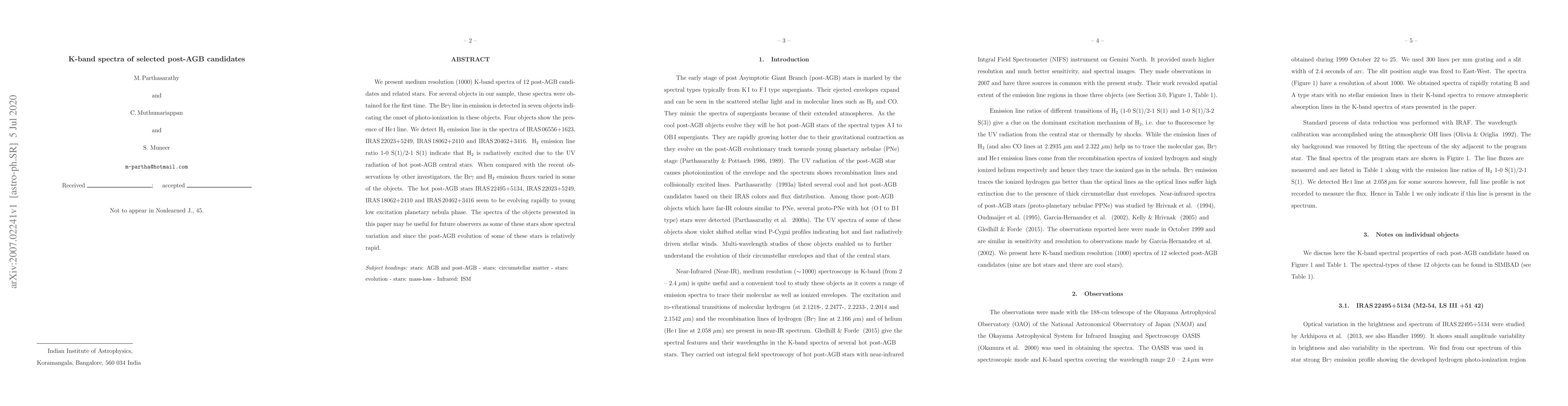 We present medium resolution (1000) K-band spectra of 12 post-AGB candidates and related stars. For several objects in our sample, these spectra were obtained for the first time. The Br$\gamma$ line in emission is detected in seven objects indicating the onset of photo-ionization in these objects. Four objects show the presence of He i line. We detect H2 emission line in the spectra of IRAS 06556+1623, IRAS 22023+5249, IRAS 18062+2410 and IRAS 20462+3416. H2 emission line ratio 1-0 S(1)/2-1 S(1) indicate that H2 is radiatively excited due to the UV radiation of hot post-AGB central stars. When compared with the recent observations by other investigators, the Br$\gamma$ and H2 emission fluxes varied in some of the objects. The hot post-AGB stars IRAS 22495+5134, IRAS 22023+5249, IRAS 18062+2410 and IRAS 20462+3416 seem to be evolving rapidly to young low excitation planetary nebula phase. The spectra of the objects presented in this paper may be useful for future observers as some of these stars show spectral variation and since the post-AGB evolution of some of these stars is relatively rapid.