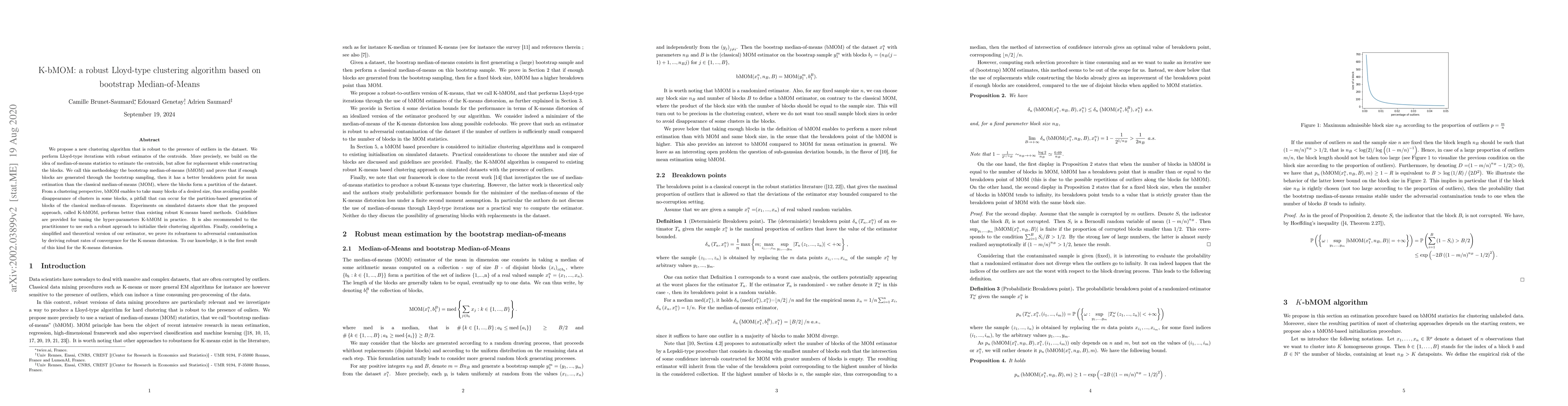 The paper introduces K-bMOM, a robust clustering algorithm based on bootstrap Median-of-Means (bMOM) to handle outliers, offering better mean estimation than classical Median-of-Means. Experiments show superior performance over existing robust K-means methods, and it provides guidelines for tuning its hyperparameters.